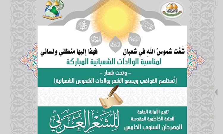 تواصلاً لمشروعها الثقافي ومشوارها في دعم الحركة الأدبية والفكرية، تستمر الأمانة العامة للعتبة الكاظمية المقدسة في تحضيراتها لإقامة مهرجانها السنوي الخامس للشعر العربي الذي سيقام تزامناً مع الولادات الشعبانية المباركة تحت شعار: (تُستلهم القوافي ويسمو الشعر بولادات الشموس الشعبانية) للمدة 6 ـ 7 شعبان 1437هـ الموافق 13ـ 14 آيار 2016م، لذا عقدت لجنة فحص النصوص الشعرية اجتماعها الأول السبت 9 نيسان ،2016، لاختيار القصائد الواردة من قبل الشعراء معتمدةً المعايير الأدبية والفنية والمهنية من خلال اختيار موضوع القصيدة، والالتزام بعروض الخليل الستة عشر، ثم النظر إلى سلامة اللغة، والصورة الشعرية، ووحدة الموضوع، وسلاسة التعبير، عدم التكلف.