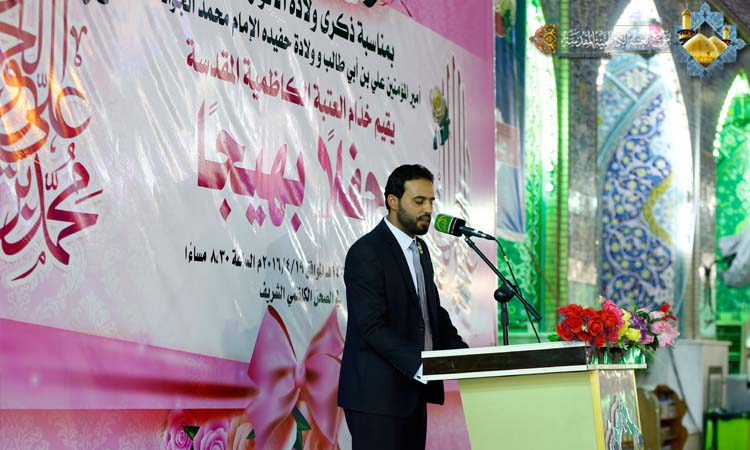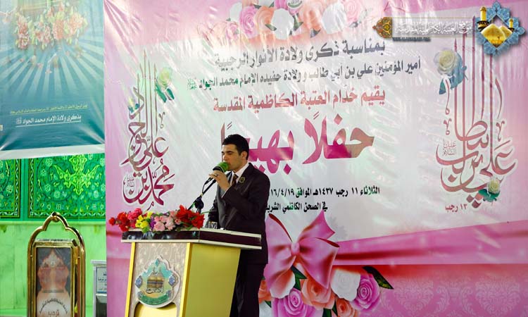تأسى لكيد الخائنين وتألمُ ... مولاي تعلم أنهم ما أسلموا وكانت هناك مشاركة أخرى لخادم الإمامين الجوادين الشاعر الحسيني السيد نبيل أبو العيس بقصيدة مطلعها: عَجَزَ المديح ونادى في فمي الكَلِمُ ... ماذا اقول بمن تَحيا به الرِمَمُ وارتقى المنصة سماحة الشيخ منير الكاظمي ليلقي محاضرته الدينية بهذه المناسبة، تحدث فيها عن عظمة شهر رجب الأصب وأيامه وفضائله وقدر لياليه، كما استعرض فيها شمائل أمير المؤمنين الشريفة وسر شخصيته، ومنهج عدالته، وشهادات من ارتبط به وبفكره الإنساني، وأشار إلى الإمام الجواد "عليه السلام" ومعجزاته للناس ودوره الريادي في قيادة الأمة، وصولاته وجولاته العلمية. وكان لفرقة إنشاد الجوادين أداء متميز بهذه المناسبة المباركة بمجموعة من الموشحات الدينية، كما تألق الرادود الحسيني مصطفى الكناني بقصائده الجميلة ليرسم الفرحة والبهجة والسرور في نفوس الحاضرين.