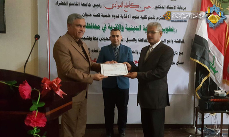 حضر وفد العتبة الكاظمية المقدسة برئاسة عضو مجلس الإدارة المهندس سعد محمد حسن في الندوة العلمية التي عقدتها جامعة القاسم الخضراء/ كلية علوم الأغذية بعنوان: (تطوير واقع السياحة الدينية والآثرية في محافظة بابل) والتي ناقشت واقع السياحة في المحافظة والسبل الكفيلة للنهوض بها وتشجيعها بما يتلاءم مع تاريخ محافظة بابل الديني والحضاري والتاريخي العريق .