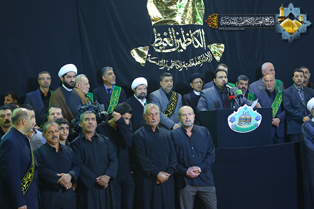 تلته كلمة السيد الأمين العام التي ابتدأها بعبارات التعزية والمواساة للإمام موسى بن جعفر الكاظم ع وللإمام المنتظر عجل الله فرجه الشريف ولمراجع الدين العظام بهذا المصاب الجلل, مشيراً الى عظم هذه الذكرى الاليمة وبدء أيام العزاء والحزن في هذه البقعة الطاهرة والتي نستذكر من خلالها كل القيم الانسانية الرسالية التي ضحى من اجلها الامام الكاظم, كما أكد على ضرورة الالتزام بنهج ووصايا أهل البيت(ع) واحياء ذكرهم العطر من خلال افشاء لغة السلام والتسامح والمحبة لنحيا حياة طيبة ملؤها الاحترام والمساواة, واشار الى ضرورة ان يكون خادم الامامين الجوادين بمستوى هذه المكانة التي يحظى بها وهي مسؤولية شرف الخدمة وهو شعار كل مؤمن, ثم تطرق الى مناقب الإمام السابع من أئمة الهدى عليهم السلام وما لاقاه من جور وظلم سلطة بني العباس الحاكمة التي حاربت الخط الرسالي والمدرسة الإلهية لأهل بيت الرحمة (ع), واشار الى ما أعدته العتبة الكاظمية لإحياء مراسم هذه الفاجعة الأليمة بعدها جرت مراسم استبدال الرايات في أجواء خيم عليها الحزن والأسى حيث َتجدُد احزان أهل البيت(ع) مع قرب حلول الخامسة والعشرين من شهر رجب الأصب. بعدها القى سماحة الشيخ (مكي آل شطيط الطائي) محاضرة جاء فيها: اليوم يرفع الموالون في العراق والعالم الاسلامي شعار الحداد والمواساة في ذكرى استشهاد امام عظيم فرض الله طاعته ومودته ومحبته, وحري بنا ان نتمسك بنهجه فهو من اهل بيت عرفوا بعصمتهم ومكانتهم الرفيعة عند الله والحق معهم وفيهم وبهم, فامامنا الكاظم(ع), يعلمنا كيف نقيم الصلاة ونأمر بالمعروف وننهى عن المنكر, وكيف نميز بين الحق والباطل وهو الرحمة المهداة بعد جده النبي الأكرم(ص) وآبائه الاطهار(ع), تلى ذلك القاء قصيدة لشاعر أهل البيت سماحة الشيخ (احمد الدر العاملي) خلدت صاحب الذكرى الاليمة والتي رسم فيها صورة رائعة عبرت عن مدى الحزن والألم الذي أصاب نفوس موالي أهل البيت بفقدان الإمام موسى بن جعفر الكاظم(ع) الذي كان نبراسا يستضاء به في ميادين العلم والمعرفة واستمرت فقرات مراسم العزاء بالمراثي الحسينية التي شارك فيها الرادود حيدر الصغير وكرار الكاظمي .
