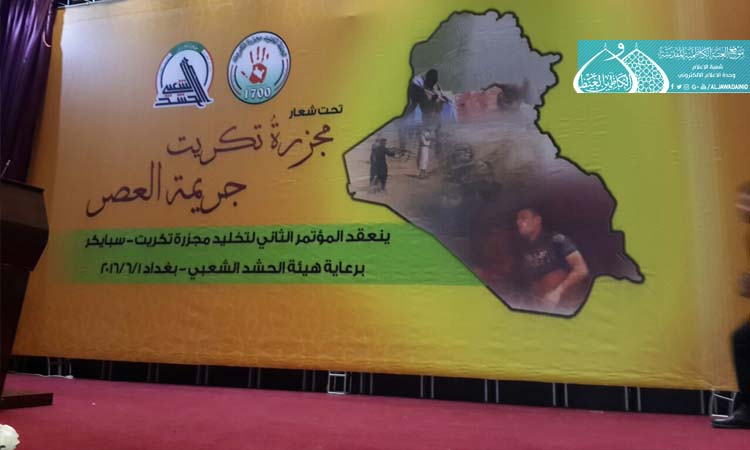 لبّى وفد العتبة الكاظمية المقدسة برئاسة عضو مجلس الإدارة المهندس سعد محمد حسن دعوة حضور المؤتمر الثاني الذي عقدته هيئة الحشد الشعبي الأربعاء 1 حزيران 2016 في قاعة الاجتماعات بمعرض بغداد الدولي تحت شعار: (مجزرة تكريت جريمة العصر) تخليداً لهذه الفاجعة الإنسانية، ووفاءً لتلك الدماء الطاهرة، وإبقاء ذكرى ضحايا "سبايكر" خالدةً في ضمائر العراقيين، وألقيت خلال المؤتمر كلمات عدّة أكدت على المطالبة بحقوق ذوي الضحايا المشروعة، والمطالبة بملاحقة الجناة وإنزال القصاص العادل بهم، والتحرك على المحافل الدولية ومنظمات حقوق الإنسان للتعريف بالمجزة باعتبارها جريمة إبادة جماعية.