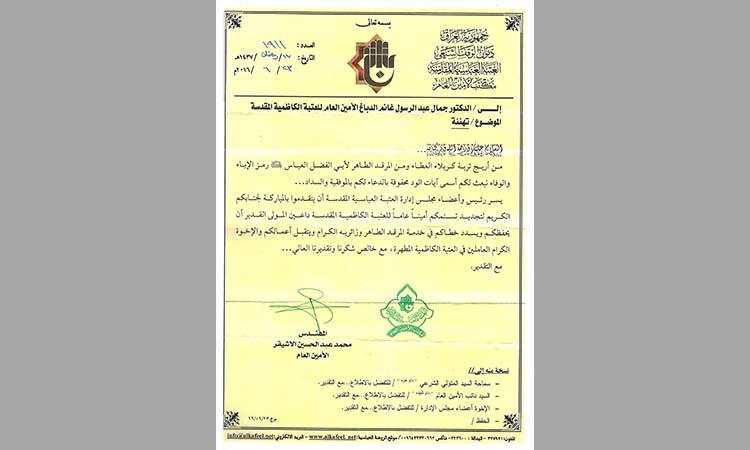 الأمانة العامة للعتبة العباسية المقدسة تقدم التهاني إلى أ.د. جمال عبد الرسول الدباغ بمناسبة التجديد لتسنمه منصب الأمين العام للعتبة الكاظمية المقدسة