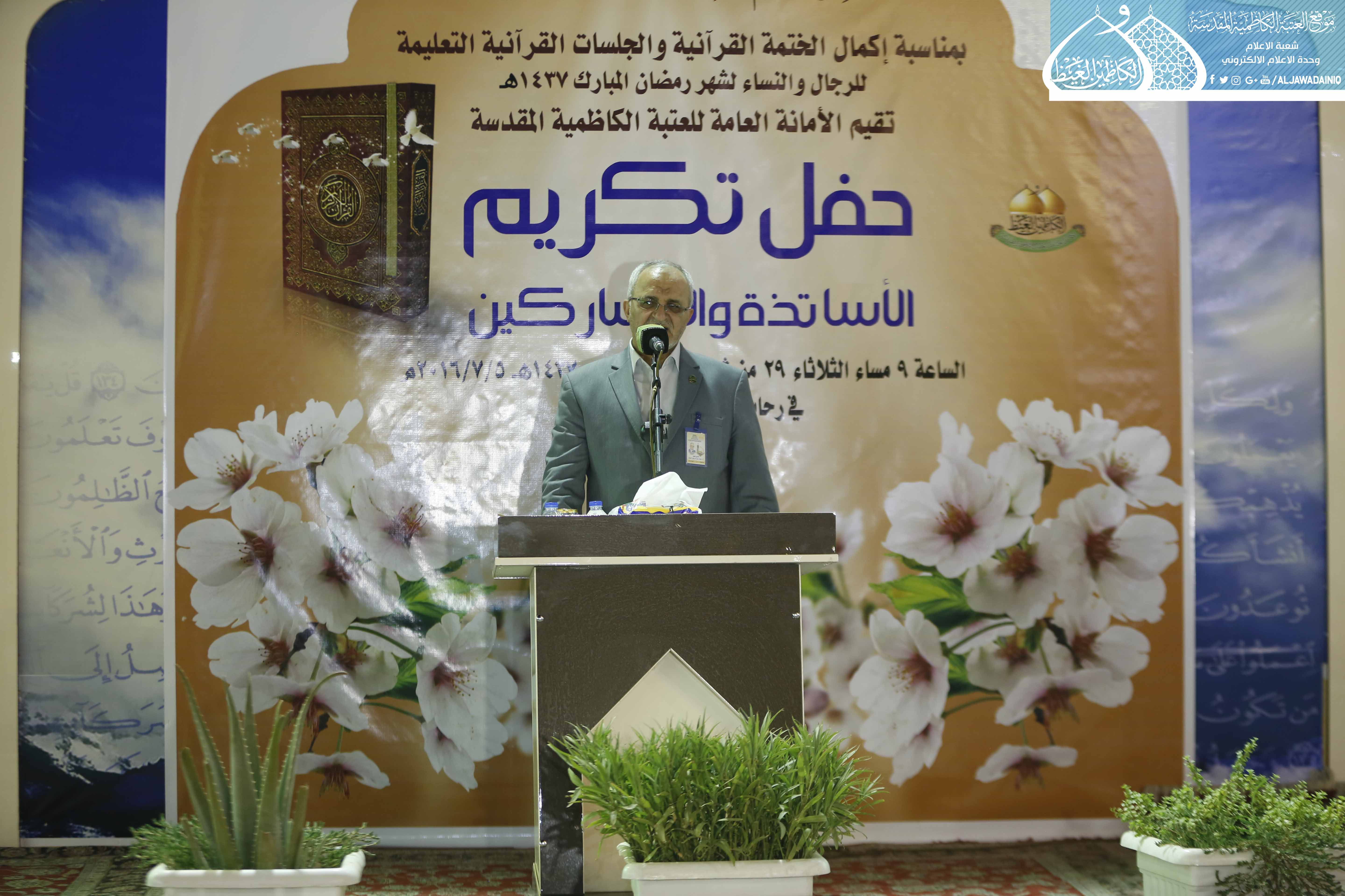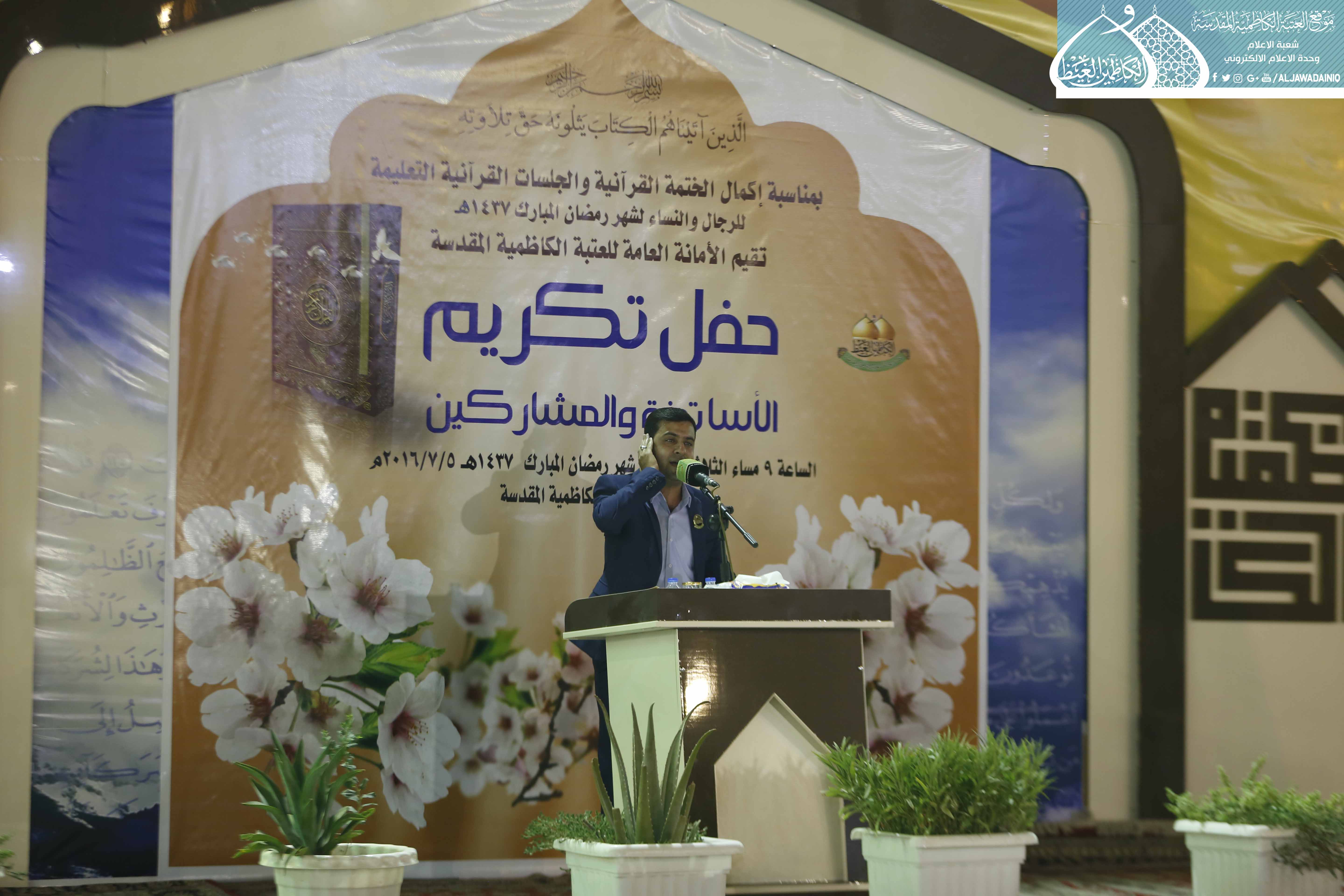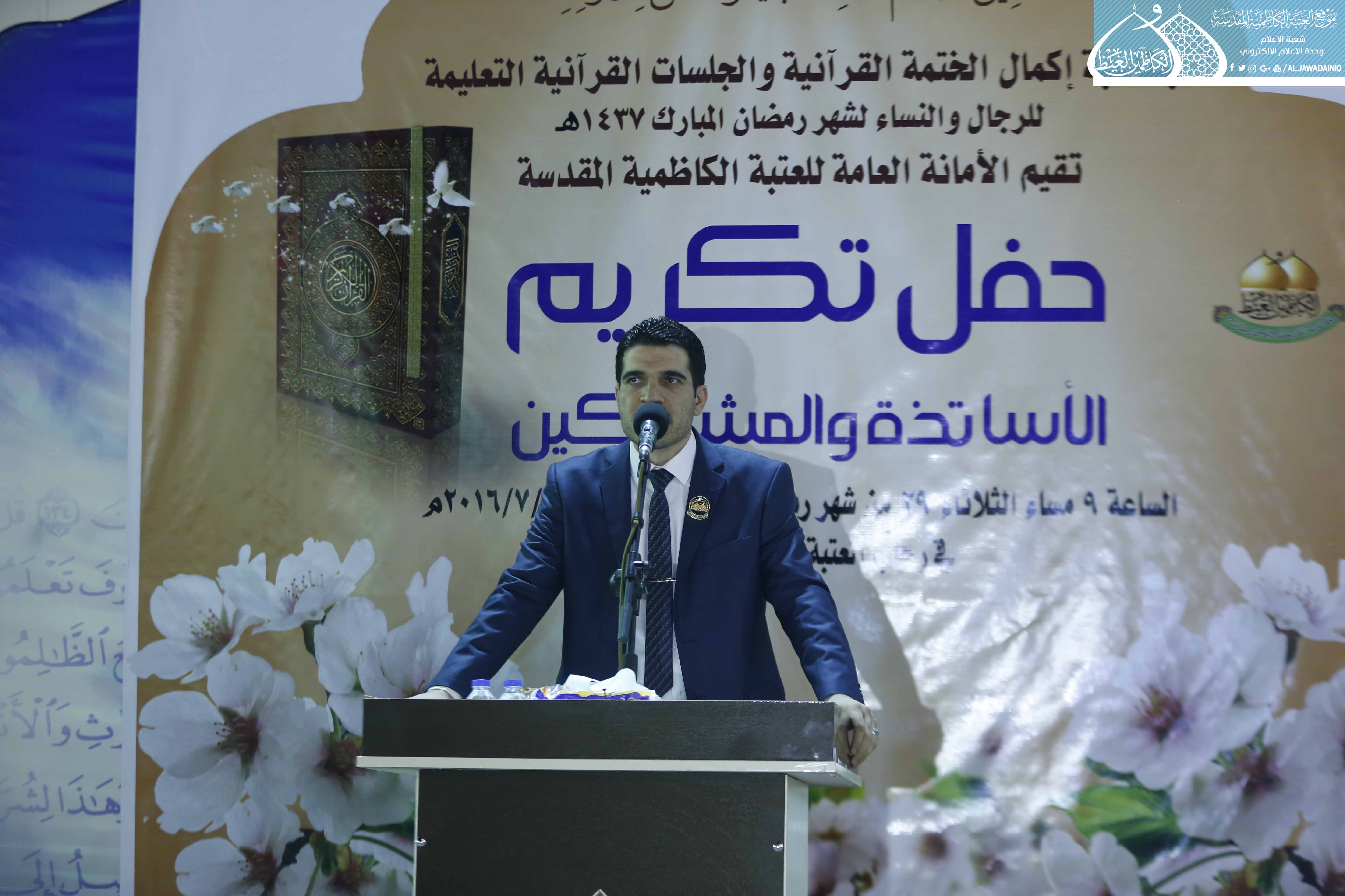استهل بتلاوة مباركة من الذكر الحكيم شنّف بها القارئ الحاج همام عدنان أسماع الحاضرين وقراءة سورة الفاتحة ترحماً على شهداء العراق وضحايا التفجير الإرهابي في الكرادة، أعقبها كلمة الأمانة العامة للعتبة الكاظمية المقدسة ألقاها أمنيها العام أ.د. جمال عبد الرسول الدباغ قائلاً: نلتقي في مساء عيد الفطر المبارك ونحن مُحزَنون لما حل بنا بفقد شبابنا في التفجير الإرهابي الآثم في الكرادة والمناطق الأخرى.