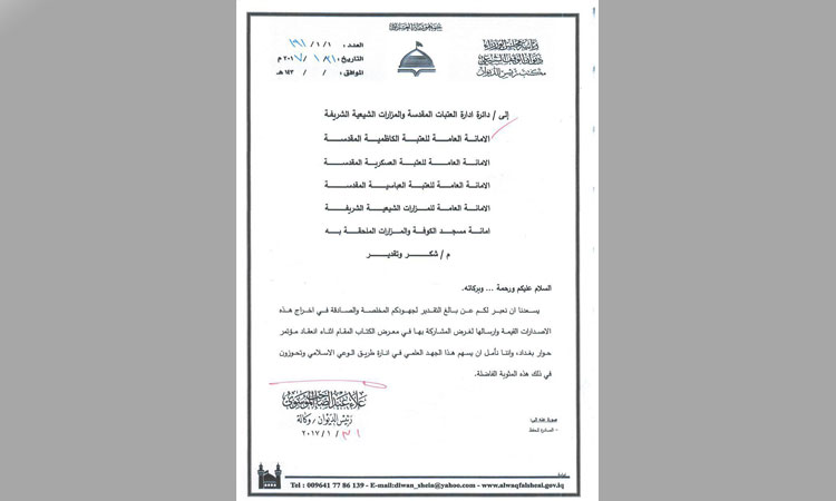 تقدم معالي رئيس ديوان الوقف الشيعي سماحة السيد علاء الموسوي بالشكر و التقدير إلى الأمانة العامة للعتبة الكاظمية المقدسة وذلك لمشاركتها الفاعلة ومساهمتها الطيبة في معرض الكتاب الذي أقيم ضمن فعاليات مؤتمر حوار بغداد.