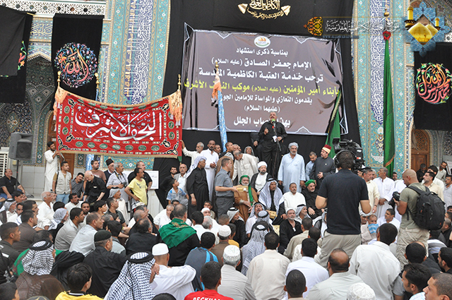 من أرض الغري مدينة أمير المؤمنين علي بن أبي طالب(عليه السلام), توافدت الحشود المؤمنة من محافظة النجف الأشرف لإحياء ذكرى استشهاد الإمام جعفر بن محمد الصادق(عليه السلام), وهم يرفعون آيات الحزن والعزاء بهذه الذكرى الأليمة والمصاب الجلل إلى الإمامين الجوادين(عليهما السلام) حيث أقاموا مجالس العزاء والتأبين في رحاب صحن التوسعة بالصحن الكاظمي الشريف ليجددوا عهد الولاء والوفاء لإمامنا الصادق(عليه السلام) والسير على نهجه القويم.