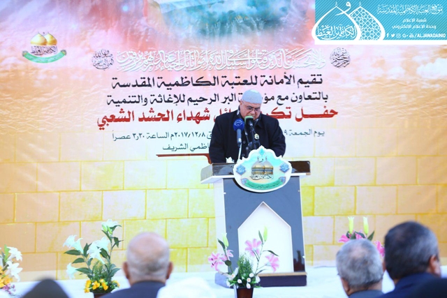 بمناسبة ذكرى ولادة سيد الخلائق أجمعين السراج المنير النبي محمد وحفيده الإمام جعفر بن محمد الصادق"عليهما السلام", وإكراماً لشهداء العقيدة والوطن السائرين في دروب التضحية والولاء والفداء، الذين عقدوا العزم لبذل أرواحهم لإعلاء كلمة الحق ونيّل عظيم شرف الدنيا وسعادة الآخرة، مُلبين لنداء الفتوى المقدسة للدفاع عن عراق المقدسات، أقامت العتبة الكاظمية المقدسة وبالتعاون مع مؤسسة البَرّ الرّحيم للإغاثة والتنمية حفل تكريم كوكبة من عوائل شهداء الحشد الشعبي تيمناّ بهذه المناسبة المباركة، بحضور الأمين العام الأستاذ الدكتور جمال عبد الرسول الدباغ، وكوكبة من عوائل الشهداء. استهل الحفل بتلاوة مباركة من الذكر الحكيم، وكلمة للعتبة الكاظمية المقدسة ألقاها أمينها العام قائلاً: ( نرحب بكم في رحاب الإمامين الجوادين "عليهما السلام" ونحن نحظى بشرف المكان في بيت من بيوت الله أذن أن يرفع فيها أسمه، وشرف مناسبة كبيرة وعزيزة ألا وهي ذكرى المولد النبوي المبارك وحفيده الإمام الصادق "عليهما السلام"، إذ نجدد ترحيبنا بعوائل الشهداء التي ينبغي أن نفتخر بما قدّمت، ومن المؤكد أن دائرة الفخر تتسع لتشمل العراق بأجمعه والعراقيين كلّهم، لأننا بفضل تلك التضحيات الجسام التي قدموها، وتلك الانتصارات التي سطرها هؤلاء الرجال، الذين رخصوا دمائهم الزاكية لأجل أن تستمر عجلة الحياة في بلدنا وننعم بنعمة الأمان، ولكن لهذا الأمان ثمناً ليس بالقليل، نسأل الله العلي القدير أن يرحم هؤلاء الشهداء السعداء، ويرفع من درجاتهم ويتولي عوائلهم بلطفه الكريم.