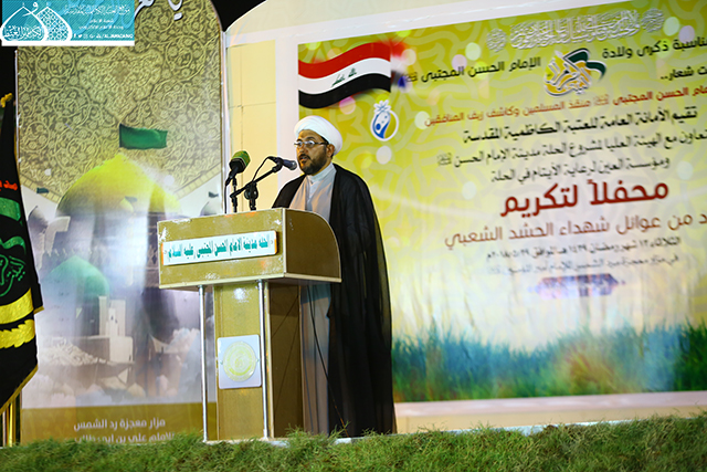 ابتهاجاً بالذكرى العطرة لولادة ثاني الكواكب المحمدية سبط النبي الأكرم "صلى الله عليه وآله وسلم" وسيد شباب أهل الجنة الإمام أبو محمد الحسن المجتبى "عليه السلام"، أقامت الأمانة العامة للعتبة الكاظمية المقدسة حفل تكريم عوائل شهداء الحشد الشعبي والقوات الأمنية الثلاثاء 29 آيار 2018 الموافق 13 شهر رمضان 1439هـ ، في مقام ردّ الشمس بمدينة الحلة الفيحاء في محافظة بابل، بالتعاون مع مؤسسة العين للرعاية الاجتماعية والهيئة العُليا لمشروع الحلة ـ مدينة الإمام الحسن "عليه السلام" تحت شعار: ( الإمام الحسن المجتبى "عليه السلام" مُنقذ المسلمين وكاشف زيف المنافقين )، بحضور عضو مجلس الإدارة الحاج محمد البناء وخدّام العتبة المقدسة ونخبة من الشخصيات الدينية والاجتماعية في مدينة الحلة، استهل الحفل بتلاوة مباركة من الذكر الحكيم، تلتها مراسم رفع الراية المباركة للإمامين الجوادين "عليهما السلام" في سارية المقام الشريف والاستماع لإنشودة الفردوس، بعدها وقف السادة الحضور لقراءة سورة الفاتحة ترحماً إلى أرواح شهداء العراق، كما شهد الحفل كلمة ترحيبية من قبل الهيئة العُليا لمشروع الحلة ـ مدينة الإمام الحسن "عليه السلام" وأشادت بدور العتبة المقدسة المتواصل في رعاية أسر الشهداء.