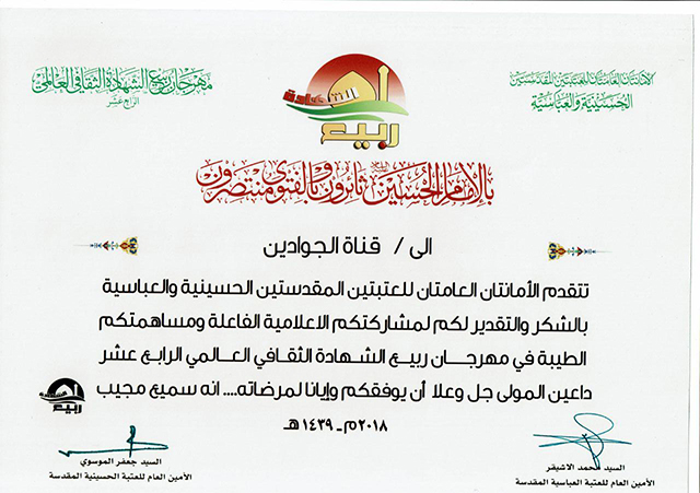 تقدّمت الأمانتان العامتان للعتبتين المقدستين الحسينية والعباسية بالشكر والتقدير إلى وحدتي إذاعة وتلفزيون الجوادين في العتبة الكاظمية المقدسة والتابعة لقسم الشؤون الفكرية والإعلام/ شعبة الإعلام ، وذلك تثميناً للجهود المباركة والدور الفاعل في مشاركتها الإعلامية في مهرجان ربيع الشهادة الثقافي العالمي الرابع عشر الذي أقيم تحت شعار: ( بالإمام الحسين "عليه السلام " ثائرون وبالفتوى منتصرون )، متمنين دوام التوفيق والسداد.