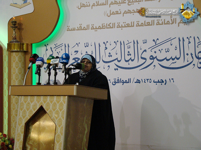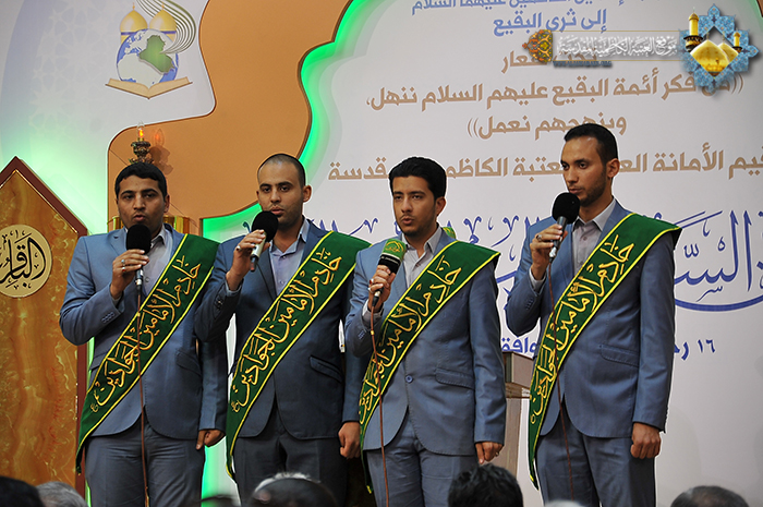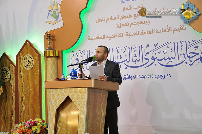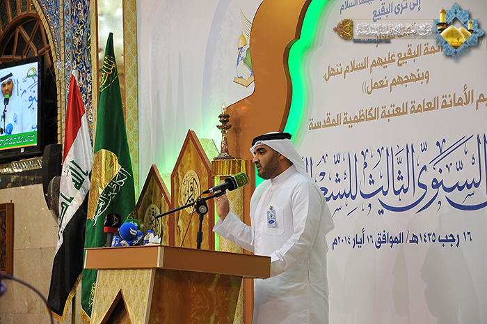 فتحت العتبة الكاظمية المقدسة أبوابها مشرعةً أمام ينابيع الفكر وفضاءات الثقافة والإبداع الأصيل، أمام الشعر والشعراء والكلمة الصادقة، أمام المفردات الجميلة في لغة الضاد، حيث مزجت بين ألوان الثقافة المتنوعة وخلاصة الأفكار، لتنسج من الخيال الواسع والإحساس المرهف أروع الصور الشعرية، وتَرسمُ لوحات وجدانية رائعة تنم عن حب أئمة البقيع (عليهم السلام)، وتسهم بتلك النتاجات المباركة رفد الحركة الأدبية والثقافية وإحياء التراث العربي الأصيل والحفاظ على الهوية الشعرية لتنير بها طريق الأجيال القادمة، إذ انطلقت صباح يوم الجمعة 16رجب الأصب 1435هـ الموافق16/5/2014م، في قاعة مضيف الإمامين الكاظمين (عليهما السلام) وقائع فعاليات المهرجان الشعري السنوي الثالث التي درجت على تنظيمه سنوياً الأمانة العامة للعتبة الكاظمية المقدسة، والمنعقد تحت شعار: " من فكر ائمة البقيع(عليهم السلام) ننهل وبنهجهم نعمل"، وحضر حفل الافتتاح الأمين العام للعتبة الكاظمية المقدسة أ.د "جمال الدباغ" وأعضاء مجلس الإدارة والشخصيات الدينية وخَدَمَة الإمامين الجوادين وكوكبة من الأدباء والكتّاب والمثقفين المتذوقين للشعر العربي الفصيح، وبمشاركة نخبة من الشعراء الذين حضروا من مختلف محافظات عراقنا العزيز، جاءوا ليساهموا برفيف نبضات قلوبهم ويظلوا بظلال قصائدهم الغراء في هذا الملتقى الأدبي. استهل حفل الافتتاح بتلاوة آيات مباركة من القرآن الحكيم شنّف بها القارئ الحاج "محمد حسين الشامي" أسماع الحاضرين بعدها صدحت حناجر فرقة إنشاد الجوادين بقراءة "أنشودة الفردوس"، تلتها كلمة الأمانة العامة للعتبة الكاظمية المقدسة وألقاها أمينها العام أ.د "جمال الدباغ" وبيّن فيها قائلاً: " نجتمع في هذه الرحاب الطاهرة لنحتفي في مهرجاننا السنوي هذا بأئمة كانوا وما زالوا قدوة ومنارا للإنسانية، إذ تركوا لنا إرثا فكريا في جميع مناحي الحياة، وهذه التركة تلقي علينا مسؤولية تأريخية لحمل رسالتهم ونشرها عبر الأجيال، ولعل من وسائل النشر والتوثيق والتثقيف هو فن الشعر العربي، وما نحن بصددهم اليوم هم أئمة أربعة تشرف بضم أجسادهم ثرى البقيع..
