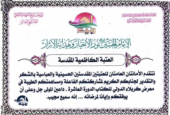 شهادة تقديرية للعتبة الكاظمية المقدسة في مهرجان ربيع الشهادة العاشر