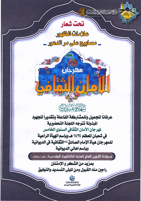 دأبت الأمانة العامة للعتبة الكاظمية المقدسة على تعزيز أطر الحركة الثقافية ودعمها لمشاريع المؤسسات الدينية والإنسانية والتي بدورها تقوم على نشر فكر وتراث أئمة أهل البيت "عليهم السلام"، فقد ساهمت في رفد العديد من الأنشطة والفعاليات العلمية والثقافية والمعرفية وعلى المستويين المحلي والدولي، وكان من بينها مشاركتها في مهرجان الأمان الثقافي السنوي الخامس الذي أقيم تحت شعار "علامات الظهور مصابيح على مرّ الدهور"، والتي جسدت فيه أروع صور التواصل والتعاون مع هيأة الإمام الصادق الثقافية المؤسسة الراعية للمهرجان ، وإن شعورها بالمسؤولية وإدراكها العالي بالقضية المهدوية وخصوصاً في المرحلة الراهنة مما جعلها أن تنظر لها برؤية موضوعية واضحة.. وتقديراً لهذه الجهود المباركة قدمت اللجنة التحضيرية للمهرجان وباسم هيأة الإمام الصادق الثقافية في محافظة الديوانية شهادة تقديرية إلى الأمانة العامة للعتبة الكاظمية المقدسة "متمثلة بأمينها العام "عرفاناً لجميل مشاركتها ودورها المتميز في فعاليات المهرجان، داعين المولى العلي القدير بالتوفيق والسداد ..