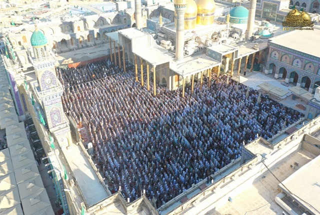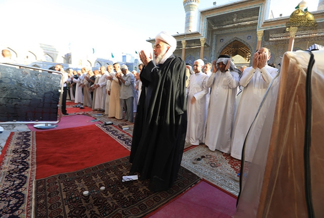 وأمَّ جموع المُصلين ممثل المرجعية الدينية العُليا في مدينة الكاظمية المقدسة سماحة الشيخ حُسين آل ياسين "دامت توفيقاته"، مستهلا الخطبة بعد الصلاة بدعاء الإمام علي بن الحسين زين العابدين "عليه السلام": (اللّهم فأوزع لوليك شكر ما أنعمت عليه وأوزعنا مثله قبله، وآته من لدنك سلطانا نصيرا، وافتح له فتحا يسيرا، وأعنه بركنك الأعزّ، واشدد أزره وقوّ عضده وراعه بعينك واحمه بحفظك وانصره بملائكتك وامدده بجندك الأغلب وأقم به كتابك وحدودك وشرائعك وسنن نبيّك ورسولك عليه وآله السّلام)، نعم يا ربي لبيك وسعديك والخير كله بين يديك والشر ليس إليك، ودعا في معرضها إلى ضرورة الرجوع إلى الله والقرب من مالك الملك والتعلق بحبال أستاره والتوبة إليه واتباع أحكامه.