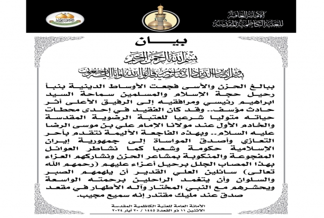 ببالغ الحزن والأسى فجعت الأوساط الدينية بنبأ رحيل حجة الإسلام والمسلمين سماحة السيد ابراهيم رئيسي ومرافقيه إلى الرفيق الأعلى أثر حادث مؤسف.. وقد كان الفقيد في إحدى محطات حياته متوليا شرعيا للعتبة الرضوية المقدسة والخادم الأول عند مولانا الإمام علي بن موسى الرضا عليه السلام.. وبهذه الفاجعة الأليمة نتقدم بأحر التعازي وأصدق المواساة إلى جمهورية إيران الإسلامية حكومة وشعبا كما نشاطر العوائل المفجوعة والمنكوبة بمشاعر الحزن ونشاركهم العزاء بهذا المصاب الجلل برحيل أعزاء عليهم (رحمهم الله تعالى) سائلين العلي القدير أن يلهمهم الصبر والسلوان وأن يتغمد الراحلين برحمته الواسعة ويحشرهم مع النبي المختار وآله الأطهار في مقعد صدق عند مليك مقتدر إنه سميع مجيب.