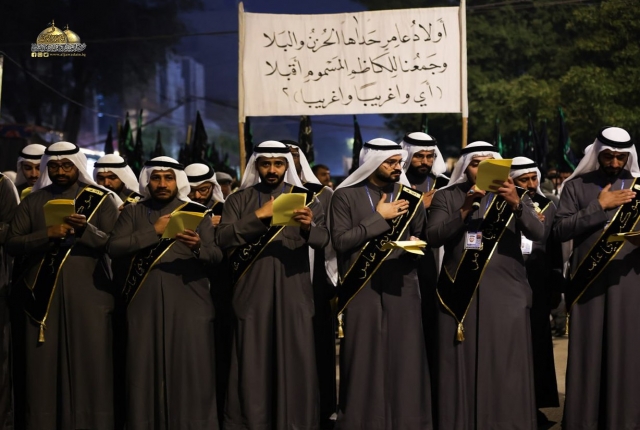 كما صدحت الحناجر بالكلمات الولائية التي أذابت القلوب وأعادت إلى الأذهان مواقف الإمام "عليه السلام" الفذة في الدفاع عن رسالة جده رسول الله "صلى الله عليه وآله" بالصبر والثبات اذ كان موكبهم التاريخي أشبه بسفينة ولاء تجوب الحزن.
