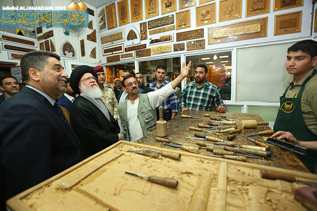 كما زار سماحته قاعة شعبة النقش والزخرفة التابعة لقسم الشؤون الخدمية واستمع الى شرح مفصل من مدير الشعبة الاستاذ (إبراهيم النقاش)عن الاعمال الفنية التي تنم عن أصالة مدينة الكاظمية المقدسة والإرث الحضاري التي تتمتع به هذه المدينة من الناحية الأثرية والعمرانية والحضارية وبعد أن تجول سماحته في أروقة القاعتين, أبدى اعجابه وارتياحه بالاعمال الفنية والجهود المبذولة من قبل منتسبي العتبة المقدسة لإظهار هذه النشاطات الثقافية بالمظهر اللائق الذي يعكس الصورة المثلى لنشر ثقافة هذا الفن الإسلامي كما أشاد سماحته بهذا المشاريع المباركة متمنياً للجميع التوفيق والسداد وقبول الأعمال.