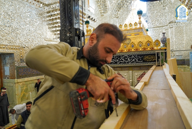 وحدة النجارة والألمنيوم تنفّذ أعمال نصب القواطع لتنظيم حركة الزائرين خلال الزيارة الرجبية