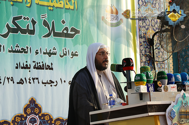 إكراماً للدماء الطاهرة التي نزفت من أجل العراق، وتقديراً لشهداء العقيدة والوطن السائرين في دروب التضحية والولاء والفداء، الذين عقدوا العزم لبذل أرواحهم ومهجهم لإعلاء كلمة الحق ونيل عظيم شرف الدنيا وسعادة الآخرة ، ملبين للنداء المقدس الذي أطلقته المرجعية العليا المتمثلة بسماحة آية الله العظمى السيد علي الحسيني السيستاني "دام ظله الوارف" في الجهاد الكفائي والدفاع عن العراق ومقدساته من دنس أعداء الله والإنسانية الإرهاب التكفيري. ومن منطلق الشعور بالمسؤولية تجاه هؤلاء المؤمنين وعوائلهم، أقامت الأمانتان العامتان للعتبتين المقدستين الكاظمية والعباسية عصر الاربعاء 10رجب الأصب 1436هـ الموافق 29/4/2015م في رحاب الصحن الكاظمي الشريف، حفل تكريم عوائل شهداء الحشد الشعبي في بغداد بحضور وكيل المرجعية العليا في مدينة الكاظمية المقدسة سماحة الشيخ حسين آل ياسين ورئيس ديوان الوقف الشيعي سماحة السيد علاء الموسوي ونائب الأمين العام للعتبة الكاظمية المقدسة السيد محمد الحيدري وأعضاء مجلس الإدارة وممثلي العتبة العباسية المقدسة ونخبة من السادة والمشايخ الفضلاء معتمدي المرجعية الرشيدة وعدد من الشخصيات الاجتماعية ومجاهدي الحشد الشعبي. استهل الحفل بتلاوة من الذكر الحكيم عطر بها مسامع الحاضرين الحاج "همام عدنان" بعدها ألقى سماحة الشيخ حسين آل ياسين كلمة المرجعية العليا المتمثلة بسماحة آية الله العظمى السيد علي الحسيني السيستاني قائلاً: " نقف بين أيدي الأمهات الرواحم والزوجات السواكن والآباء المعظمين والأطفال الأيتام بين آمالهم وآلامهم، نقف عبيداً لإحسان شهدائهم، فإن كان المعلم حرفاً يستحق الاتباع والعبودية بمعنى الطاعة، فكيف بهؤلاء الأبطال الذين قد علمونا دروساً في الذود عن الدين والقيم والوطن والمقدسات، ودروساً في نسيان كلّ الآلام والحرمان الذي يعانون منه، عندما هبوا مسرعين مبادرين متقربين إلى الله سبحانه وتعالى، مقتدين بالصالحين من محمد وآله الطاهرين، على بصيرة من أمرهم عندما لبّوا نداء نائب الإمام المنتظر "عجل الله فرجه الشريف" فتوى سماحة آية الله العظمى السيد السيستاني "دام ظله الوارف" ، والتي أيدها جميع مراجعنا في النجف الأشرف، لبّوها وهم يرون أنفسهم مقصربن في حق الدين والأوطان وكلهم نداء لواعية الإمام الحسين "عليه السلام"، ونحن تحت ظلال الإمامين الهمامين الجوادين "عليهما السلام" نهنئ هؤلاء الأبطال المتميزين في إقامتهم لشعائر الله في ساحات القتال ذوداً عن مبادئهم وطاعة لمرجعيتهم..