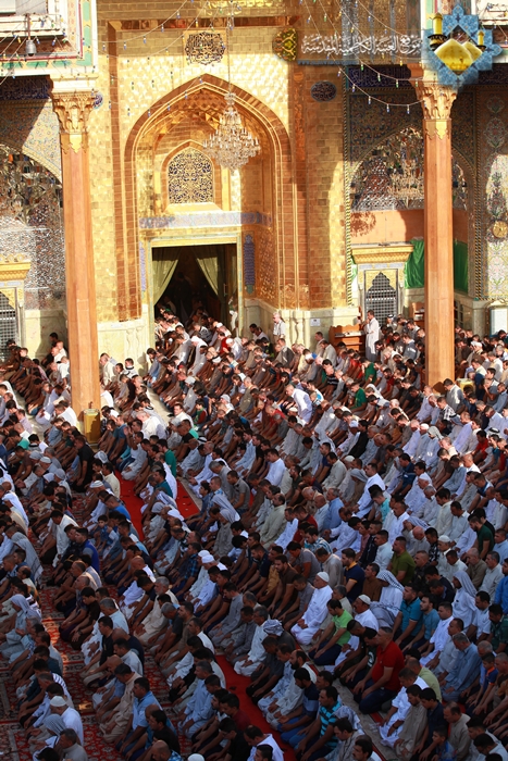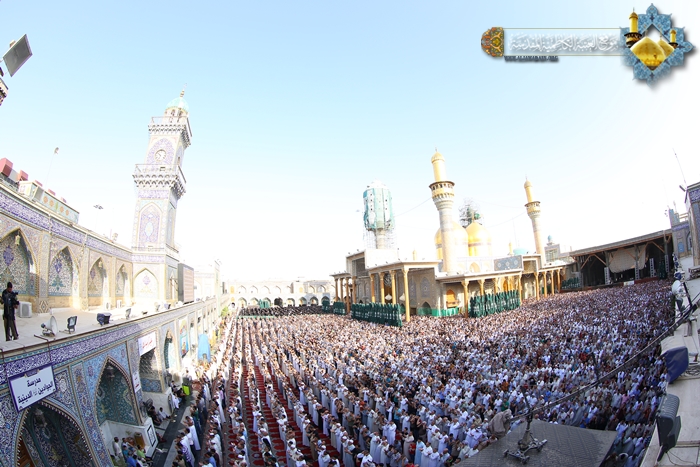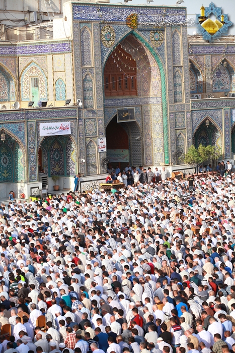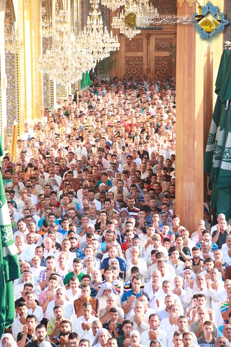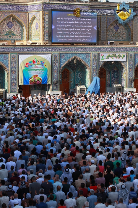 شهدت رحاب الصحن الكاظمي الشريف في صباح اليوم الأول من شهر شوال 1436هـ الموافق 18/7/2015م أول أيام عيد الفطر المبارك توافد حشود المؤمنين الوافدين لزيارة الإمامين موسى بن جعفر ومحمد بن علي الجواد "عليهما السلام"، والتأمت تلك الجموع في مشهد إيماني كبير, لأداء شعائر صلاة عيد الفطر المبارك, بإمامة سماحة الشيخ حيدر النصراوي وبعد أداء الصلاة ألقى خطبة عبادية تقدم فيها بالتهنئة إلى إلى مقام صاحب العصر والزمان "عجل الله فرجه الشريف" وإلى مقام المرجعية العليا المتمثلة بسماحة آية الله العظمى السيد علي الحسيني السيستاني "دام ظله الوارف" وإلى جميع المسلمين في مشارق الأرض ومغاربها، وأكد على الالتزام بالتقوى والخوف من الله والتماس التوبة والعودة إلى حضرته القدسية لأن من خلالها يصل الإنسان إلى مقام ربه ورسوله وأهل البيت"عليهم السلام" مبيناً إن التقوى هي توفيق من الله يعطيها إلى ثلة من عباده الصالحين، فهي الغاية التي شرع الله تعالى من خلالها الصلاة والصيام، فعلينا أن ننعم بفيضها ومن الذائبين ببودقتها. أما في خطبته الثانية ركز سماحته على حديث رسول الله "صلى الله عليه وآله وسلم" حين قال : " الناس نيام فإذا ماتوا انتبهوا " فقد أشار من خلاله إلى من تلبس بمعصية جبار السموات والأرض والابتعاد عن طاعة ورسوله، فهو نائم لن يفيقه إلا الموت. وبيّن بعض القضايا الاجتماعية والأخلاقية والسلوكية التي يعاني منها مجتمعنا الإسلامي, وسلط الضوء على هذه الانحرافات التي تصيب فئة الشباب ومظاهر الاستخفاف بالعبادة و التبرج والفجور، مؤكداً على العودة إلى ثقافة أئمتنا الأطهار والتحلي بصفاتهم وأخلاقهم، وأن نكون بمستوى الارتباط بهم "عليهم السلام".