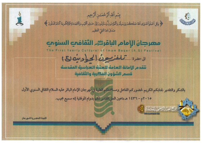 قدمت الأمانة العامة للعتبة العباسية المقدسة / قسم الشؤون الفكرية والثقافية شهادة تقديرية لأسرة قناة الجوادين في العتبة الكاظمية المقدسة، لمشاركتها الفاعلة في مهرجان الإمام الباقر "عليه السلام" الثقافي السنوي الأول المتزامن مع الذكرى السنوية لفاجعة هدم قبور أئمة البقيع "عليهم السلام"، داعين الله العلي القدير لهم بدوام التوفيق والنجاح في إيصال رسالتها الإنسانية ونشر الفكر العقائدي والإيماني لأئمة أهل البيت "عليهم السلام".