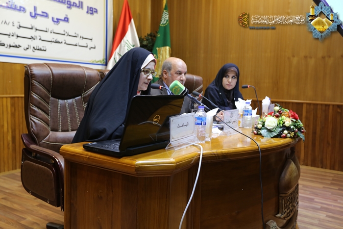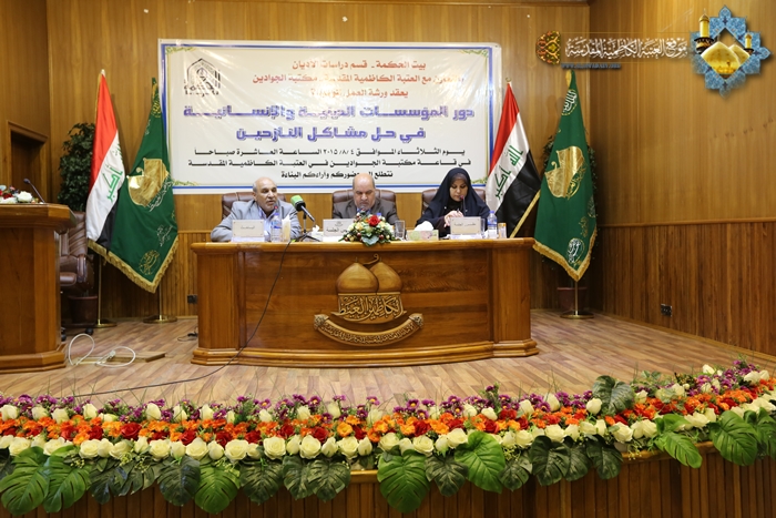 مضيفاً: نحن في السنة الثانية ولا زالت المشكلة موجودة وحلولها غير واضحة إذ نسأل الله تبارك وتعالى أن يوفق الجميع لانعقاد هذه الورش المباركة والخروج منها بأكثر قدر وما يمكن انجازه لهذه العوائل الكريمة، والمزيد من الانتصارات لقواتنا الأمنية وحشدنا المقدس في تحريرالمناطق المغتصبة لأجل عودة النازحين إلى ديارهم وهو الحل الحقيقي والأمثل للمشكلة. بعدها بدأت ورشة العمل التي ترأس جلستها الدكتور أياد كريم الصلاحي وقدم فيها أهداف ومضامين هذه الورشة التي تحاول الخروج برؤية واضحة لمشكلة النازحين وسبل معالجتها في وضعنا الراهن، من خلال المؤسسات الخدمية، كما أوضح أهم الآثار السلبية الصحية والتربوية والاجتماعية والاقتصادية والنفسية التي يواجهها هؤلاء النازحون. ثم استمع الحضور إلى الباحث السيد محمد إياد جواد الشهرستاني الذي قدم ورقة بحثية عن دور العتبات المقدسة في دعم النازحين وتطرق خلالها عن حالة النازحين المنتشرين في محافظات العراق والبالغ عددهم ما يقارب(2،800000) نازح والمشاكل التي تواجهها الدولة العراقية ووزارة الهجرة والمهجرين منذ 10/6/2014م، كما بيّن الدور الفاعل للعتبات المقدسة في إدارة هذا الملف ابتداءً من العتبة العلوية المقدسة التي أقامت مركز لإيواء النازحين ونفذت فيه برنامجها الإنساني وما تحتاجه تلك الأسر حيث وفرت لهم الحاجات الإنسانية والاجهزة المنزلية والملابس فضلاًعن العناية الطبية، كما سلط الضوء على دور العتبة الحسينية والعباسية التي شكلت لجان لمتابعة شؤون النازحين وتأمين السكن لهم في مدن الزائرين وتوفير سبل الراحة والخدمات، كما كان هناك زيارات ميدانية للمناطق الصامدة والمحاصرة منها آمرلي وحديثة والعلم والضلوعية والبغدادي وإيصال المساعدات إليها وصولاً إلى قرى إقليم كردستان العراق، وكان للعتبة الكاظمية المقدسة دور كبير في استنفار جهودها في توفير وتقديم الخدمات اللازمة للعوائل النازحة، وتواصلت بجمع التبرعات المالية التي وصلت ما يقارب (200،000،000) مئتان مليون دينار، لتوفير الحاجيات الضرورية لهم فضلاًعن الزيارات الدورية لمتابعة شؤونهم. وخرج الباحث بعدة مقترحات وهي إنشاء المخيمات النموذجية أو إنشاء دور واطئة الكلفة للنازحين، والإسراع في إيصال المنح المالية لهم، ومناشدة وزير التعليم العالي والبحث العلمي، ووزير التربية لتذليل العقبات أمام الطلبة النازحين. بعدها جاء دور الباحثة د. زينب شاكر الواسطي وقدمت بحثهاً قيماً بعنوان " دور المرجعية في دعم الوحدة الوطنية ـ النازحين انموذجاً "، وأكدت فيه أن التوحيد منهاج لصيانة الأمة لتصل إلى مداها الواسع، مبينةً أن ما قامت به المرجعية الدينية العليا بعد فتوى الجهاد الكفائي ورعايتها للنازحين قد حاولت تفتيت الصراع الداخلي والاحتقان الطائفي ووحدت المجتمع العراقي بكل أطيافة وأعراقه ومكوناته. كما أشارت إلى المؤسسات الإنسانية والخدمية التي تتبناها المرجعية المباركة، وما تقدمه من مساعدات، كما تناولت بعض الاحصائيات عنها ومن بينها مؤسسة العين للرعاية الاجتماعية. وكذلك استمع الحضور إلى بحث قدمته د. دنيا علوان الدفاعي من جامعة بغداد " حول التكافل الاجتماعي الأسرة المنكوبة في منهج الثقلين" وأوضحت خلاله المسؤولية التي تقع على عاتق الفرد والمجتع، وبينت دور القرآن الكريم في إشاعة روح العطاء والبذل والإيثار، ومدرسة أهل البيت "عليهم السلام" التي حثت على نشر فكر الإحسان والعطاء والإنفاق في سبيل الله لما له من آثار إيجابية في إصلاح الأمة. وأكدت الباحثة أن الأخوة الإيمانية والتراحم والشعور بالآخرين واحدة من تجسيدات مبدأ التكافل الاجتماعي من خلال استشهادها بالاحاديث النبوية الشريفة. وقدم الدكتور زاهد جهاد البياتي بحثاً عنوانه: " النازحون التركمان بين آلام الماضي ومشاكل الحاضر " تناول فيه نبذة مختصرة عن التركمان وتاريخه ووجوده على أرض العراق، وكيف كانوا ولا يزالون جزءً أصيلاً من الشعب العراقي، وعرض جملة من مشاكلهم 
