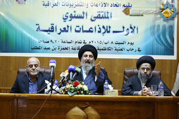 وكان لسماحة السيد حميد محمود الحسيني رئيس اتحاد إذاعات وتلفزيونات العراق كلمة بهذه المناسبة أشار فيها إلى أهمية اللقاء والتواصل في رحاب الإمامين الجوادين "عليهما السلام"، لأنهما مصدر للإنسانية فيجب أن تستلهم المؤسسات الإعلامية منهم هذه السمة وأن يكونوا للإنسانية جمعاء وينتموا للعراق ويبتعدوا كلّ البعد عن الانتماء والميول والإتجاهات ومنزلق الصراعات الطائفية لأنهم أصحاب رسالة هادفة، فيجب أن يحافظوا من خلال مهنيتهم على الهوية الوطنية والعقائدية، ويحرصوا على إيصال الكلمة الصادقة إلى الجماهير.