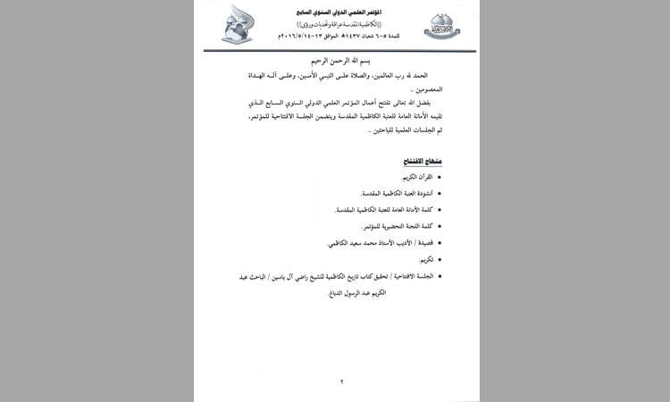 وضعت اللجنة التحضيرية للمؤتمر العلمي الدولي السابع الذي سيعقد للمدة من 5ـ6 شعبان الموافق 13ـ14 آيار 2016م تحت شعار: مدينة الكاظمية (عراقة وتحديات ورؤى ) اللمسات الأخيرة والاستعدادت النهائية لاستكمال تحضيرات انعقاده، إذ تعلن اليوم عن البرنامج التعريفي الخاص بالفعاليات وأسماء الباحثين المشاركين في المؤتمر في الجدول المبين أدناه.