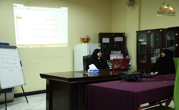 حيث ألقت مسؤولة الإرشاد الديني في مركز القرآن الكريم التابع لقسم الشؤون الفكرية والثقافية الخادمة الدكتورة دنيا جميل محمد ورقة بحثية بعنوان: (مكانة المرأة في الإسلام: السيدة زينب "عليها السلام" أنموذجاً)، كما شهدت الندوة استعراض موضوعات عدّة منها: أثر المرأة في المجتمع وتكريم الإسلام للمرأة، والشبهات الغربية المعاصرة: دعاوى تحرير المرأة، وتعنيف المجتمع للمرأة وصمود المرأة المسلمة