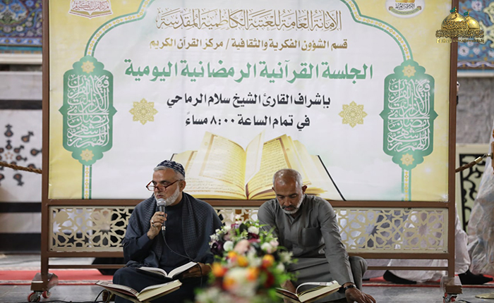 دأبت الأمانة العامة للعتبة الكاظمية على إقامة النشاطات القرآنية المختلفة، وكان من بينها الجلسة القرآنية الرمضانية اليومية، والتي تُقام يومياً بعد صلاتي المغرب والعشاء بإشراف القارئ الشيخ سلام الرماحي، حيث يتم خلالها قراءة جزء كامل من المُصحف الشريف في كلّ ليلةٍ من ليالي الشهر الكريم، والاستماع للقرّاء المشاركين وتقديم كلّ ما يهمّهم من ملاحظات تخصّصية قيّمة تساعدهم في تطوير أدائهم القرآني وصولاً إلى التلاوة المُتقنة.