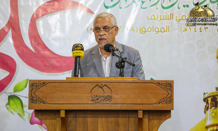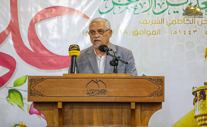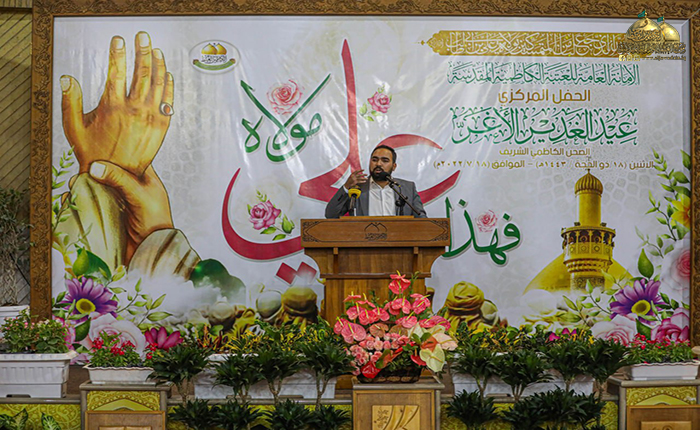 وأضاف: أن واقعة الغدير واقعة غضة طرية مهما تعاقبت عليها الأحقاب والأعوام وكأنها واقعة بالأمس، لا تبليها الحوادث أو تحرّفها الحكومات مهما حاولت ومهما سخرّت من جهود وطاقات في إخفاء حقيقتها، لأنها محل العناية السامية والرعاية المتواصلة من الله بما حفها من آيات بينات تتلى آناء الليل وأطراف النهار، وبما أولاها رسول الله "صلى الله عليه وآله وسلم" من عنايته واهتمامه، وبما سخر الله لها من ألسن الشعراء والمنشدين كي يلفت سبحانه وتعالى نظر الناس إلى ما يدينون به لله في باب خلافته الكبرى، وكي يُبقي حقيقة الغدير بوجهها الجميل حقيقة ناصعة ثابتة بعيدة عن التغيير والنسيان وسيقى شذاها قائما يجوب أجواء السنين حتى يأذن الله تعالى بظهور ولده الحجة بن الحسن عجل الله تعالى فرجه الشريف ليملأ الأرض قسطا وعدلا بعدما ملئت ظلما وجورا). وكان للشعر نصيب في الحفل المبارك حيث ألقى الشاعر الأديب السيد نبيل أبو العيس الكاظمي قصيدة ولائية رائعة بعنوان (غديرية الإمام علي) ومن أبياتها:
