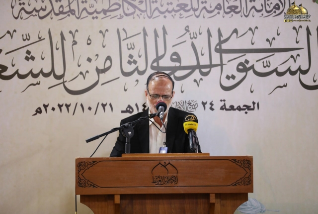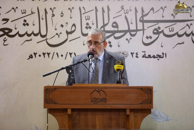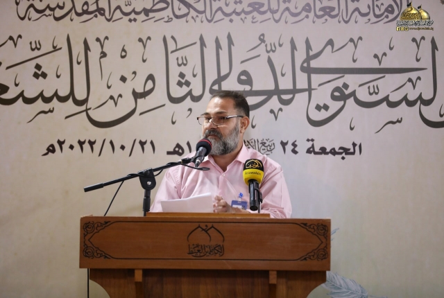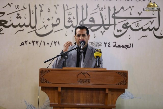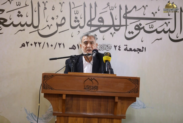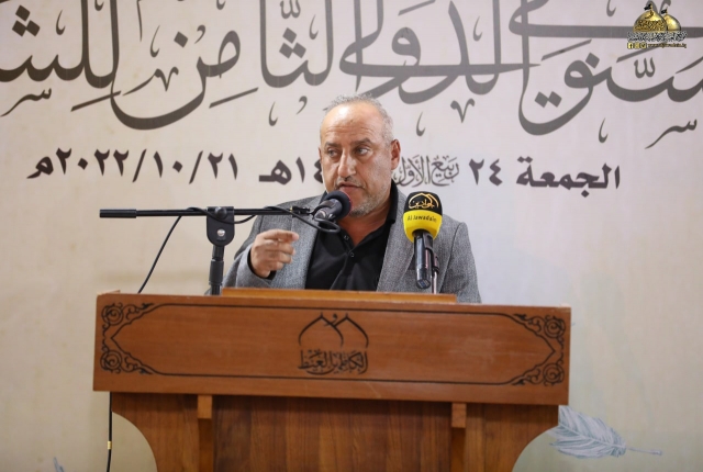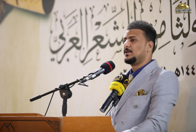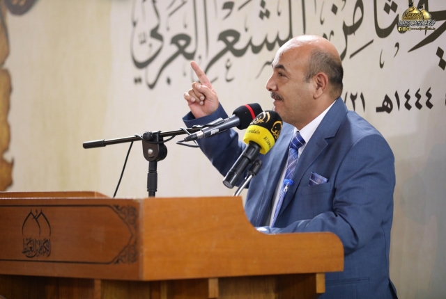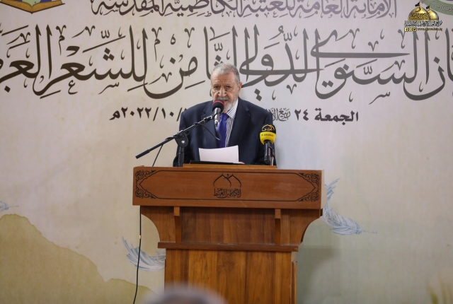تلتها كلمة اللجنة المنظمة للمهرجان السنوي الثامن للشعر العربي، والقاها عضو مجلس إدارة العتبة المقدسة المهندس جلال علي محمد بيّن خلالها قائلاً: (معروف أن الشعر هو من الفنون الوجدانية الراقية، وهو ذلك الكلام الموزون لحناً، العذب لغة، لا يتقنه إلّا من حباه الله بهذه الموهبة الجميلة، فالشعر مرآة تعكس واقع حياتنا وما ترافقها من تفاعلات تصحبها رقة المشاعر ورهافة الأحاسيس كما أنه يعكس صدق ولاءاتنا ودرجة إيماننا وحقيقة مبادئنا، فالشعر يترجم الأحاسيس العصية على البوح أحيانا، إنه مناجاة الروح للروح.. وصناعة لغوية للتعبير عن ذواتنا.. عن إنسانيتنا.. وقد توظف القصيدة إلى موعظة أو نص إرشادي هادف، لذا لابد للشعر أن يحترم ذائقة القراء والعمل من خلاله على الارتقاء بهم فهو في ذات الوقت احترام للغة العربية ولفن الشعر في آن واحد ويجب الحفاظ عليهما من الإسفاف.