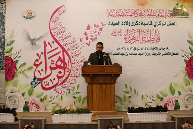 استُهل الحفل بتلاوة أيٍ من الذكر الحكيم شنّف بها أسماع الحاضرين قارئ العتبة الكاظمية المقدسة السيد عبد الكريم قاسم، بعدها كلمة الأمانة العامة للعتبة الكاظمية المقدسة وألقاها أمينها العام جاء فيها قائلاً: (لا يختلف ذوي العقول المنصفة على أن السيدة فاطمة الزهراء (عليها السلام) هي المثل الأعلى الذي قدّمته الرسالة الإلهية للمرأة، فقد صاغتها يد العناية الربانية لتكون قدوةً للحياة الكريمة، وأسوةً للفضائل والقيم الإنسانية، فهي نسخة ناطقة بتعاليم الوحي الإلهي صِدّيقة لا تفعل غير الحق، ولا تتبع سوى الهدى.. فحريّ بنا أن نقتدي بالسيدة الزهراء البتول (عليها السلام)، وأن نجعل نصب أعيننا المثل الإسلامية العليا التي تجسدت فيها عليها السلام فكراً ومنهجاً وسلوكاً.