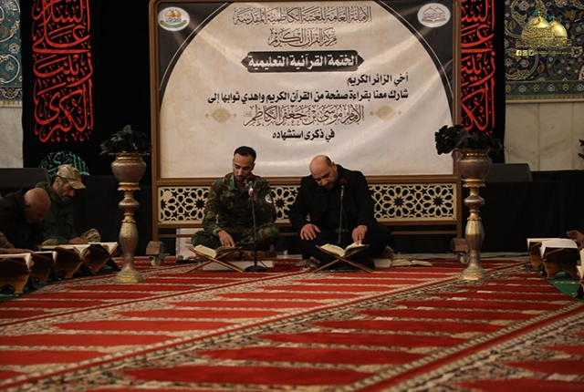 استضاف مركز القرآن الكريم في العتبة الكاظمية المقدسة نخبة من ملبي فتوى الدفاع الكفائي، للمشاركة في الختمة القرآنية التعليمية المُقامة في رحاب الصحن الكاظمي الشريف، حيث صدحت حناجرهم وجادت قرائحهم بتلاوات قرآنية مباركة تعطّرت بها أجواء الصحن الكاظمي الشريف أهدي ثوابها إلى باب الحوائج إمامنا موسى بن جعفر الكاظم "عليه السلام" تزامناً مع ذكرى شهادته الأليمة، ليختتم المجلس بقراءة دعاء الفرج تعجيلاً لظهور القائم من آل محمد المهدي المنتظر " أرواحنا لمقدمه الفدا".