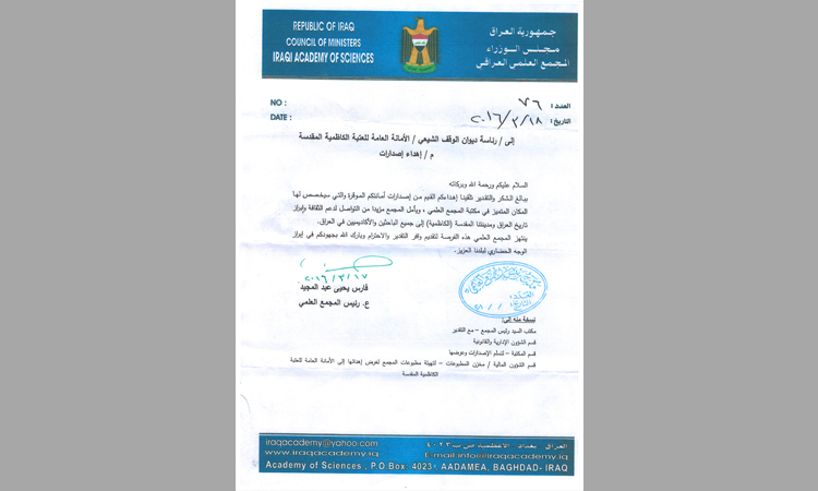 نظراً للدور الرائد الذي تقوم به الأمانة العامة للعتبة الكاظمية المقدسة واهتمامها بالمشاريع الثقافية وتعاونها ومشاركتها للمؤسسات الأكاديمية والبحثية والجامعات العراقية فضلاً عن رفدها بالنتاجات الفكرية والثقافية للعتبة المقدسة لأجل تحقيق أهداف رسالتها الإنسانية السامية في نشر التراث الفكري والعلمي للإئمة الأطهار "عليهم السلام" وتقديراً لهذه الجهود تقدم المجمع العلمي العراقي بالشكر والتقدير إلى الأمانة العامة للعتبة الكاظمية المقدسة لدعمها المتواصل للثقافة وإبراز الوجه الحضاري لبلدنا العزيز.