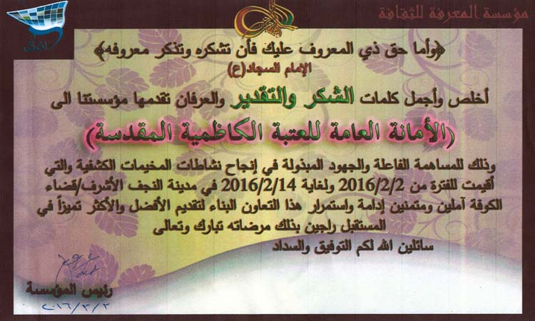 تقدمت مؤسسة المعرفة الثقافية بخالص الشكر والتقدير إلى الأمانة العامة للعتبة الكاظمية المقدسة لمساهمتها الفاعلة وجهودها المباركة في إنجاح نشاطات المخيمات الكشفية التي أقيمت في محافظة النجف الأشرف/ قضاء الكوفة فضلاً عن دعمها على الصعيد الفكري والمعرفي والتنموي ورعاية الطاقات الشبابية سائلين المولى القدير لها بالتوفيق والسداد والتواصل والعطاء في أداء مسؤوليتها لأجل تقديم أفضل الخدمات الإنسانية لجميع طبقات المجتمع.