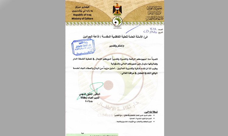 إذاعة الجوادين تحصل على شهادة تقديرية من قبل دار ثقافة الأطفال