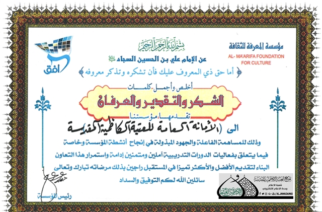 تقدمت مؤسسة المعرفة الثقافية ببالغ الشكر والتقدير والعرفان إلى الأمانة العامة للعتبة الكاظمية المقدسة لمساهمتها الفاعلة وجهودها المباركة في دعمها للأنشطة والفعاليات والدورات التدريبيةالتي تقوم بها المؤسسة على الصعيد الفكري والتنموي، والسعي لبناء مجتمع واعٍ مدرك لواجباته وعارفاً بحقوقه. سائلين المولى القدير لها بالتوفيق والسداد والتواصل والعطاء في أداء مسؤوليتها لأجل تقديم أفضل الخدمات الإنسانية لجميع طبقات المجتمع.