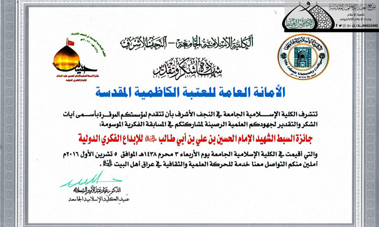 توجهت عمادة الكلية الإسلامية الجامعة بالشكر والتقدير إلى الأمانة العامة للعتبة الكاظمية المقدسة، انطلاقاً من الشعور بالمسؤولية بمد جسور التعاون والتواصل مع الجامعات العراقية والمؤسسات العلمية ومواكبتها للحركة الفكرية والمعرفية والثقافية، وجهودها العلمية الرصينة في المسابقة الفكرية الموسومة: (جائزة السبط الشهيد الإمام الحسين بن علي "عليه السلام" للإبداع الفكري الدولية)، والذي بات دورها كبيراً في خدمة المجتمع وترسيخ القيم والمبادئ السامية فيه، ونشر الرسالة الإنسانية للإمامين الجوادين "عليهما السلام".