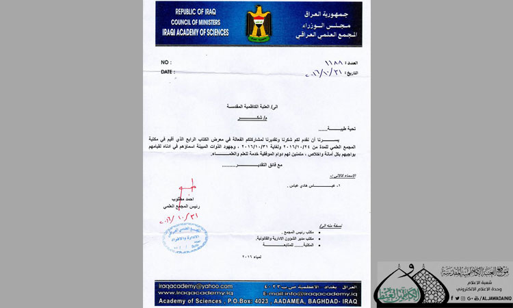 توجه المجمع العلمي العراقي بالشكر والتقدير إلى الأمانة العامة للعتبة الكاظمية المقدسة وذلك لمشاركتها المتميزة في معرض الكتاب الذي احتضنته أروقة مكتبة المجمع العلمي، واهتمامها في دعم الحركة العلمية والثقافية، ونشر تراث أهل البيت "عليهم السلام" وتحقيق أهدافها وبرامجها التنموية على الصعيد الرسالي والفكري والإنساني.