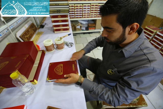 أنامل الإبداع في وحدة مكتبة القرآن الكريم التابعة لقسم خدمات العتبة المقدسة ترتقي بعملها وجهودها الإيمانية المباركة المكلّلة بشذى القرآن وعبير الدعاء، بعد أن قامت بالعناية والترميم لأعداد كثيرة من المصاحف ونسخ الأدعية والزيارات الموجودة في العتبة الكاظمية المقدسة والمحافظة عليها والتي قد تأثّرت لطبيعة الظروف الجوية ولملامسة الأيدي المستمرة تلك الكتب ممّا عرّض بعضها للتلف بدرجات متفاوتة، واليوم تنتهي من أعمال المرحلة الثانية من صيانة تلك المجلدات، وللتعرف على أهمّ الأعمال المنجزة تحدث إلينا الحاج همام عدنان مدير وحدة مكتبة القرآن الكريم قائلاً: أخذت ورشة تجليد الكتب على عاتقها ترميم المصاحف وكتب الأدعية التي تعرض بعضها للتلف وأخرى تمزقت أغلفتها، وبعد تراكم الخبرات لخدّام مكتبة القرآن الكريم وتوفّر الامكانات والدعم اللامحدود للمشروع من قبل الأمانة العامة للعتبة الكاظمية المقدسة تمكَنّا من تسخير كلّ ما لدينا من طاقة فنية وذوقيّة وسواعد واصلت الليل بالنهار حيث شهدت المرحلة الثانية صيانة أكثر من (3) آلاف مصحف وألفي نسخة من كتاب مفاتيح الجنان وأكثر من (10) آلاف كتيب زيارة وبمدّة وجيزة، حيث تمّ إضافة عدد من الجماليات لتزيين هذه الكتب منها المثلث الذهبي والشريط الفاصل وتغليفها بمادة "الفايبلون"، لتتميز بحلّتها الجديدة ونضارتها، وسيتمّ توزيعها على مكتبات الصحن الكاظميّ الشريف تزامناً مع الذكرى الميمونة لولادة منقذ البشرية وسيد الكائنات نبينا محمد "صلى الله عليه وآله وسلم"، واليوم إن شاء الله تعالى ننطلق بالمرحلة الثالثة والأخيرة لإكمال صيانة بقية المصاحف والكتب.