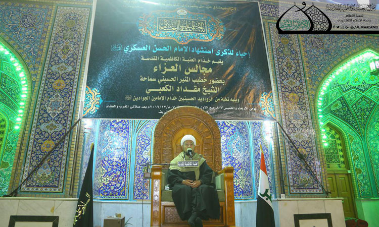 أحيت الأمانة العامّة للعتبة الكاظمية المقدسة ذكرى استشهاد سراج أهل الجنة وخزانة الوصيين الإمام الحسن العسكريّ "عليه السلام", من خلال برنامج خاص اشتمل على إقامة المحاضرات الدينية ومجالس العزاء والتأبين انطلقت فعالياته في رحاب الصحن الكاظمي الشريف بحضور الخطيب الحسيني فضيلة الشيخ مقداد الكعبي، حيث استعرض في محاضراته القيّمة أبعاد الشخصية الفذّة للإمام العسكريّ "عليه السلام" التي وطّنها لحمل رسالة الإسلام والحفاظ على دين جده رسول الله "صلى الله عليه وآله" وسعيه في إحقاق الحق والعدل بين الناس ورعاية الأمة في الوقت الذي تعرّض فيه "عليه السلام" واتباعه إلى الاضطهاد والتضييق من قبل حكّام عصره وأعـداءه ومـبغضيه . وتطرّق الشيخ الكعبي إلى شذرات من حياة الإمام الشريفة وغزارة علمه، وكيف كان علماء عصره بأمَسّ الحاجة إلى الانتهال من نمير علمه ونهجه وفكره المبارك، كما تناول بعض القضايا الاجتماعية السلبية التي تؤثر على المجتمع الإسلاميّ مؤكداً ضرورة إصلاحها من خلال التخطيط لها بالشكل الصحيح لضمان سلامة الفرد والمجتمع من مسالك الانحراف. وشارك في إحياء هذه المجالس عدد من رواديد العتبة الكاظمية المقدسة بأصواتهم الشجية وإلقائهم مجموعة من المراثي والقصائد الولائيّة التي أثارت الحزن الشجون عند الزائرين الذين جاءوا ليجدّدوا مواساتهم للإمامين الجوادين "عليهما السلام" بهذا المصاب الجلل.