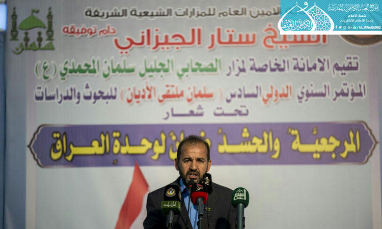 حضر وفد العتبة الكاظمية المقدسة في حفل افتتاح المؤتمر السنوي السادس(سلمان ملتقى الأديان) للبحوث والدراسات الذي أقيم برعاية الأمانة العامة للمزارات الشيعية الشريفة بالتعاون مع الأمانة الخاصة لمزار الصحابي الجليل سلمان المحمدي"رضوان الله تعالى عليه" تحت شعار: ( المرجعية والحشد ضمان لوحدة العراق )، وشهد المؤتمر مشاركة دولية ومحلية واسعة، حيث ألقيت خلاله كلمات عدّة أكدت ضرورة البحث العلمي عن الحقيقة ولا بد للعالم أن يكون له صوتاً وموقفاً للحفاظ على المفاهيم الإسلامية العظيمة، وأثنت على المواقف النبيلة لقوات الحشد الشعبي في صون الوطن والمقدسات والأعراض، كما أوضحت تلك الكلمات أدوار العتبات المقدسة والمزارات الشيعية الشريفة الكبيرة في دعمها للحشد الشعبي، وبينت أن المزارات الشريفة هي محطة علمية حصينة ينبع منها نور الإسلام الأصيل..