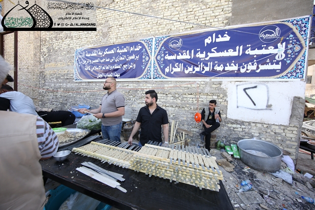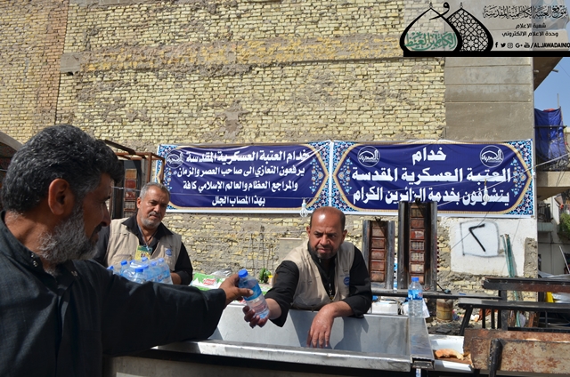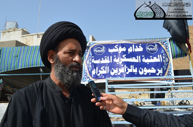 نقيم العزاء بإشراف العتبة العسكرية المقدسة ورعاية العتبتين الحسينية والكاظمية المقدستين، وبحمد الله تعالى نقدم الخدمة للزائرين منذ خمسة أيام متوالية حيث شملت الإطعام والراحة وتجهيز الصمون من أفران خاصة. وحقيقة كان للعتبة الكاظمية المقدسة الدور الكبير في تهيئة المكان المناسب لنا وتسهيل إجراءات الخدمة كافة ، ونحن بدورنا ــ من خلالكم ــ نوصي أنفسنا وجميع المعزين بالتقيد والالتزام بثقافة أهل البيت والسير على نهجهم القويم لما لأهل البيت "عليه السلام"، من أثر كبير على واقعنا الحاضر ونحن نتصدى لأخطر هجمة عدوانية ونواصل الانتصار تلو الانتصار عليهم. نسأل الله تعالى التوفيق والسداد لجميع خدمة أهل البيت "عليه السلام".