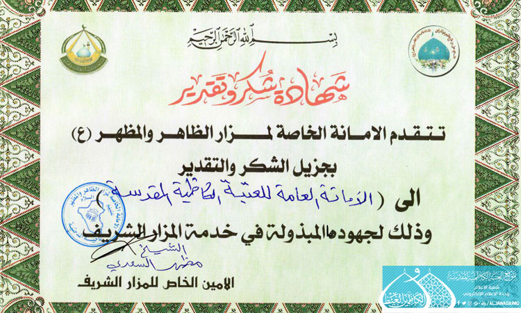 حرصت الأمانة العامة للعتبة الكاظمية المقدسة على مد جسور التعاون والتواصل والمشاركة مع العتبات المقدسة والمزارات الشريفة والمؤسسات الدينية كافة، لأجل أن تحقق ما تصبو إليه وهو دعم الحركة العلمية والفكرية والثقافية، ونشر فكر أهل البيت "عليهم السلام" والحفاظ على هذا التراث الثر . وتقديراً لهذه الجهود تقدمت الأمانة الخاصة لمزار الظاهر والمظهر "عليهما السلام" بالشكر والعرفان إلى الأمانة العامة للعتبة الكاظمية المقدسة لدورها الكبير في دعم نشاطات المزار الشريف.