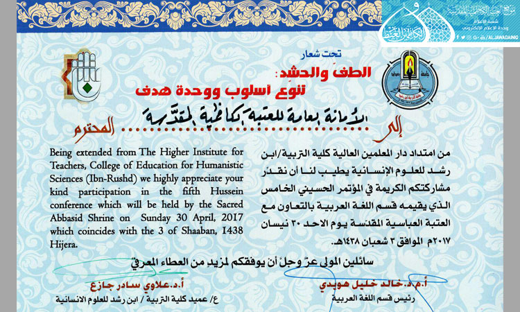 تقدمت كلية التربية ابن الرشد للعلوم الإنسانية بالشكر والتقدير إلى الأمانة العامة للعتبة الكاظمية المقدسة، وذلك لمشاركتها في المؤتمر الحسيني الخامس الذي أقامه قسم اللغة العربية بالتعاون مع الأمانة العامة للعتبة العباسية المقدسة تحت شعار: ( الطف والحشد: تنوع أسلوب ووحدة هدف )، سائلين المولى العلي القدير أن يوفق الجميع لمزيد من التعاون المعرفي.