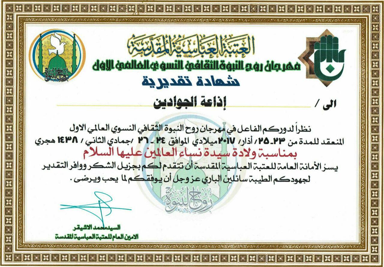 تقدمت الأمانة العامة للعتبة العباسية المقدسة بالشكر والتقدير إلى الأمانة العامة للعتبة الكاظمية المقدسة وإذاعة الجوادين، وذلك لمشاركتها الفاعلة في مهرجان روح النبوة الثقافي النسوي العالمي الأول، الذي أقيم بمناسبة ولادة السيدة الزهراء "عليها السلام"، حيث تؤكد هذه المبادرات المباركة تعزيز العلاقات والتواصل بين العتبات المقدسة والمزارات الشريفة لتحقيق أهدافها وبرامجها التنموية على الصعيد الرسالي والفكري والإنساني لخدمة أهل بيت النبوة "عليهم السلام" وزائريهم الكرام.