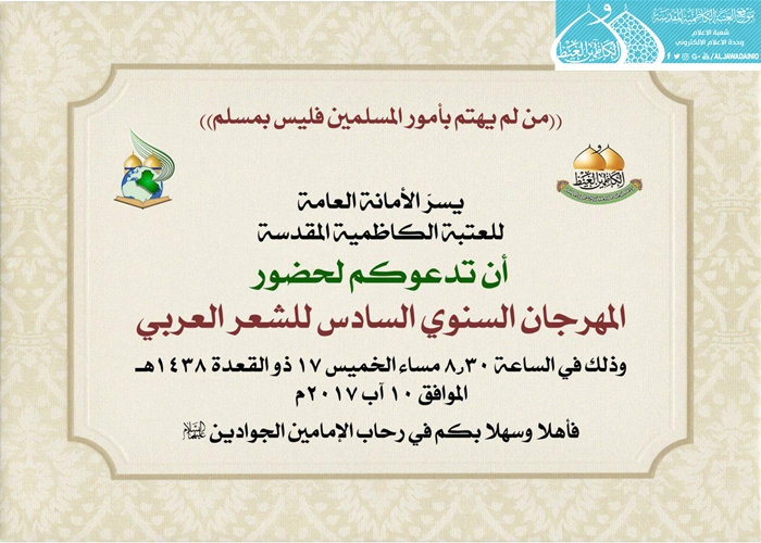 استكملت الأمانة العامة للعتبة الكاظمية المقدسة استعداداتها كافة لانطلاق فعاليات المهرجان السنوي السادس للشعر العربي التي ستشهده رحاب الصحن الكاظمي الشريف في تمام الساعة 8:30 من مساء يوم الخميس 17 ذي القعدة 1438هـ ، الموافق 10 آب 2017 تحت شعار: (الشعرُ ودوره في التطلع نحو مستقبل أفضل)، وبهذه المناسبة يسر الأمانة العامة للعتبة الكاظمية المقدسة أن توجه دعوتها إلى الشخصيات الاجتماعية والأكاديمية والأدباء والمثقفين والمتذوقين للشعر العربي العمودي لحضور هذا الملتقى الثقافي الذي سيشارك فيه (20) شاعراً من الذين أجازت لجنة التحكيم قصائدهم، نصفهم من داخل العراق من بغداد وكربلاء المقدسة والحلة والنجف الأشرف والناصرية والبصرة، والنصف الآخر من البحرين ولبنان وسوريا والسعودية، فمرحباً بكم.