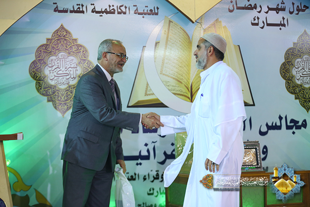 نظم قسم الشؤون الفكرية والثقافية/ دار القران الكريم/ في العتبة الكاظمية المقدسة حفل توزيع الهدايا على المشاركين في الختمة القرآنية التعليمية لكلا الجنسين شملت مراحل عمرية مختلفة والذي اقيم في رحاب الصحن الكاظمي الشريف طيلة أيام شهر رمضان المبارك, وحضر الحفل المبارك الامين العام للعتبة الكاظمية المقدسة أ. د (جمال الدباغ) وعدد من اعضاء مجلس الادارة والأساتذة المهتمون بالشأن القرآني وجمع غفير من زائري الإمامين الجوادين(ع), بدأ الحفل بتلاوة معطرة من الذكر العزيز شنف بها اسماع الحاضرين المقرئ(بلاسم جليل) ثم تلاها كلمة دار القرآن الكريم القاها السيد (عبد الكريم قاسم) وجاء فيها: (ان القران الكريم هو منهج للحياة الكريمة التي يريدها الله لعباده والسلوك القويم الذي وضعه الباري وفرضه على خلقه لينعموا به, ونحن نودع الشهر الكريم شهر رمضان المبارك الذي غمرنا بالخير والعطاء والبركة, حيث كان للقران الكريم نصيب كبير في العتبة الكاظمية المقدسة, من خلال الختمة المرتلة والجلسات والمحافل القرآنية, فكان الهدف منها تعميم الفائدة لكل من أراد ان يتعلم القرآن الكريم والتدبر بآياته).