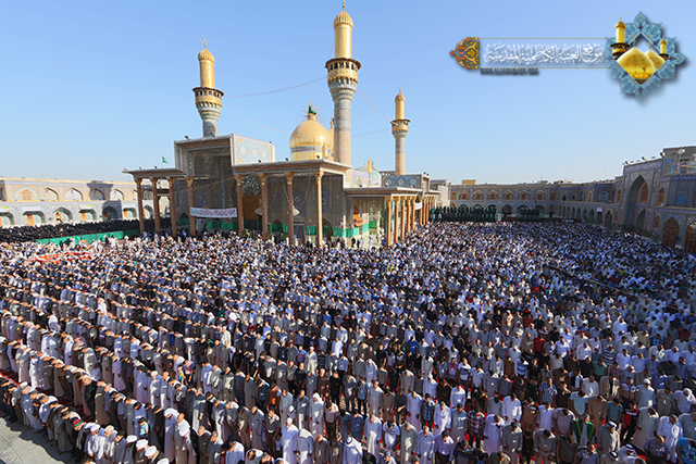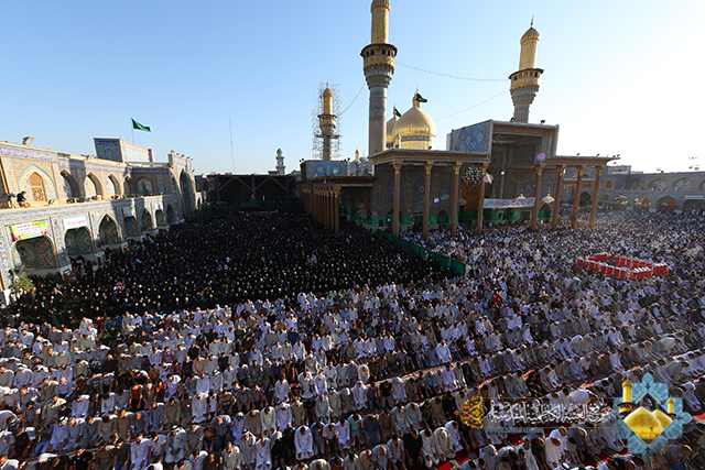 التأمت حشود المؤمنين الوافدين لحرم الإمامين موسى بن جعفر ومحمد بن علي الجواد (ع) في مشهد إيماني كبير احتضنه الصحن الكاظمي الشريف, لأداء مراسم الزيارة لهما في أول أيام العيد السعيد، والمشاركة بشعائر صلاة عيد الفطر المبارك, في هذه الرحاب الطاهرة بإمامة سماحة الشيخ (حيدر النصراوي) وبعد أداء الصلاة ألقى خطبة عبادية ركز في مطلعها بالدعاء بتعجيل فرج مولانا صاحب العصر والزمان الإمام المهدي المنتظر(عج), وقدم التهاني والتبريكات إلى مقام الإمام صاحب العصر والزمان (عج) وإلى مقام المرجعية الرشيدة و العالم الاسلامي كافة. بعدها أكد في خطبته على مبدأ الطاعة والتقوى والخوف من الله و التماس التوبة والعودة إلى حضرته القدسية لان من خلالها يصل الانسان الى مقام ربه ورسوله وأهل البيت(ع).