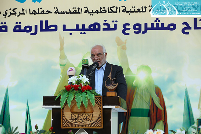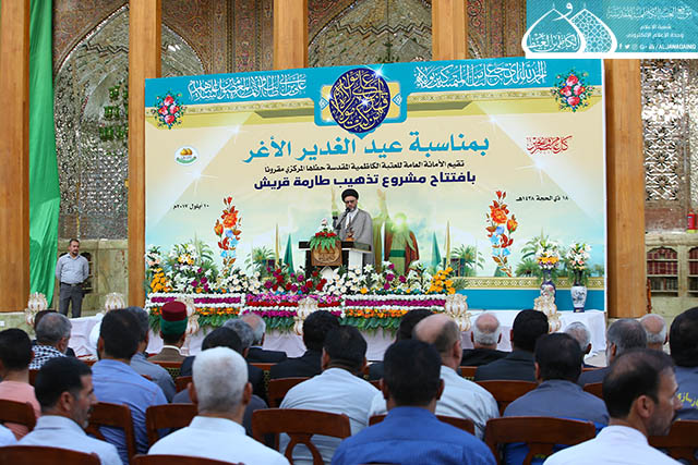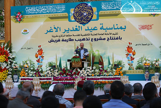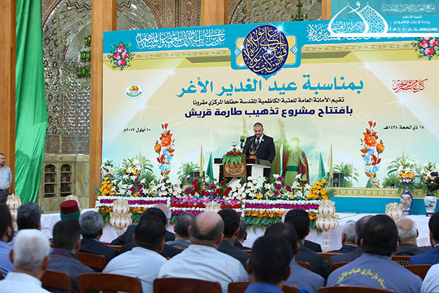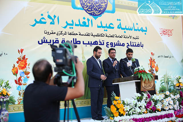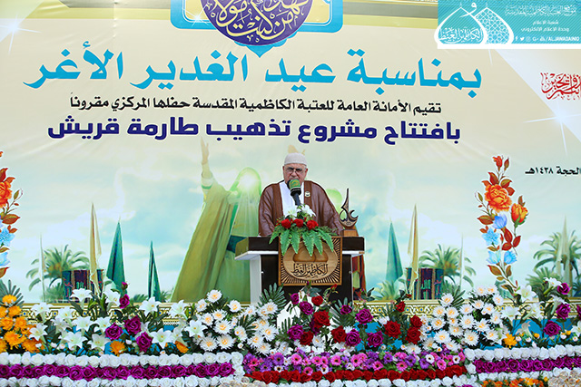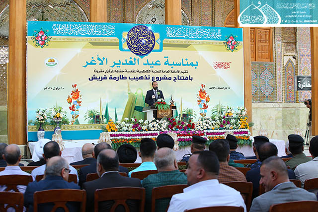 بعدها ارتقى المنصة رئيس مؤسسة الكوثر لإعمار العتبات المقدسة المهندس حسن بلاراك وألقى كلمة بهذه المناسبة بيّن خلالها قائلاً: نشهد اليوم ثمرة خدمة أخرى وهو افتتاح مشروع إعادة تذهيب طارمة صحن قريش ونقدمه هدية للإمامين الجوادين "عليهما السلام " ولخدمة العتبة الكاظمية المقدسة ولمحبي أهل البيت "عليهم السلام"، إن هذا المشروع هو ضمن سلسلة المشاريع التي شهدتها العتبة المقدسة امتزج فيها الفن المعماري مع العشق لأهل بيت النبوة "عليهم السلام"، وذكر في حديثه تمت المباشرة باعمال المشروع في عيد الغدير الأغر سنة 1436هـ وانجازه بعد سنتين تزامناً مع نفس الذكرى العزيزة على قلوب الموالين، حيث بلغت المساحة التي تم تذهيبها (120م)، بواقع (3500) بلاطة ذهبية مختلفة الاحجام. ثم ألقى سماحة الدكتور السيد صفاء الفحام محاضرة بهذه المناسبة عنوانها: ( عيد الغدير عنوان وحدة المسلمين وعزتهم وقوتهم)، تحدث فيها عن أهمية الحدث الكبير الذي وقع في السنة العاشرة للهجرة التي أرسى دعائمه القرآن الكريم، وشيدّه النبي الأكرم "صلى الله عليه وآله"، مؤكداً أن الابتعاد عن يوم الغدير قد كلّف الأمة الإسلامية الكثير حيث تداعت عليها الأمم وأحاطت بها المخاطر من كلّ حدب وصوب، فليس هناك ما يجمع كلمة المسلمين ويوحدّ صفوفهم ويحقق أهدافهم ويلم شتاتهم ويجعلها كالبنيان المرصوص كمثل يوم الغدير الأغر ذلك اليوم الذي وضع الرسول الأعظم "صلى الله عليه وآله" الأمر بموضعه ونصابه حين بلغ بالأمر الإلهي ونصّب الإمام علي بن أبي طالب "عليه السلام" ولياً على كلّ مسلم ومسلمة لكي يحفظ إنجازات الإسلام.. كما شهد الحفل المبارك مشاركة شعرية لخادم الجوادين الشاعر رياض عبد الغني الكاظمي بقصيدة ولائية من الشعر ومنها هذه الأبيات: بيومٍ صافح الدنيا *** بعهدِ وليّهِ السندِ لبشرى النعمة الكبرى الـ *** ـتي تمت إلى الأبدِ ومنها أبيات شعرية بمناسبة افتتاح تذهيب طارمة صحن قريش فيها تاريخ شعري: ككاظم غيظها موسى *** وفخر جوادها السندِ هما من أتحفـــاك بما *** أقامـكِ منبرَ البلدِ