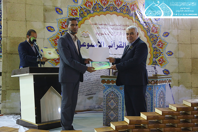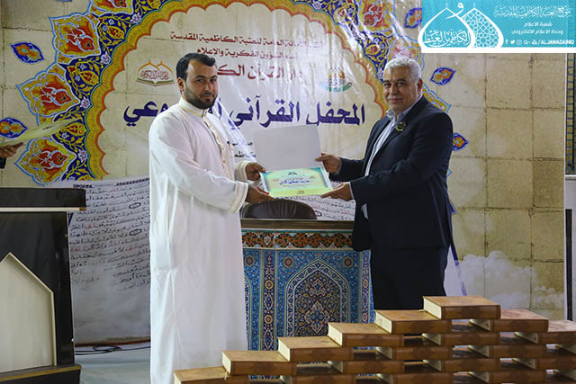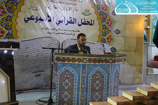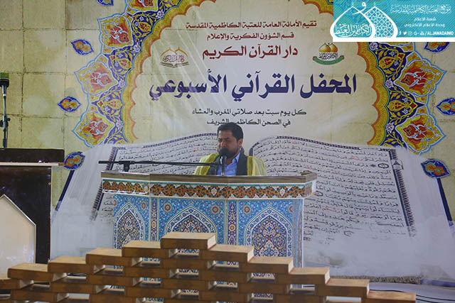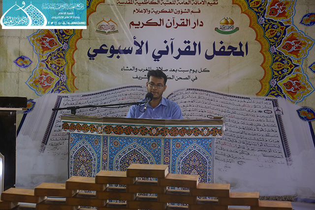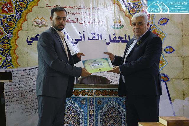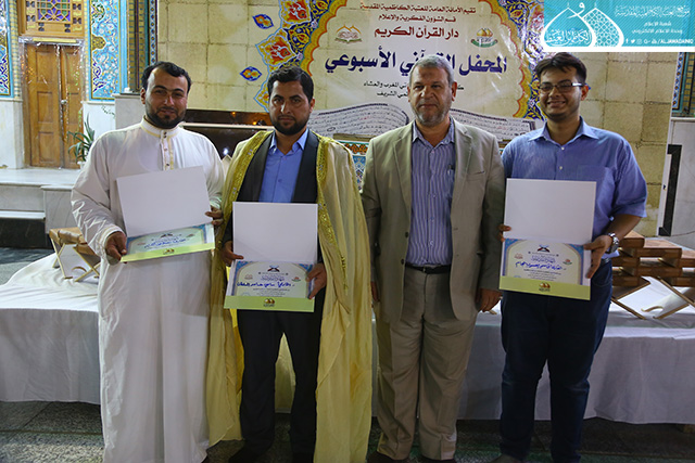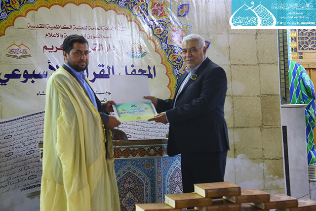 في إطار سعي الأمانة العامة للعتبة الكاظمية المقدسة بتفعيل روابط التواصل القرآني، والمساهمة في نشر الثقافة القرآنية وتزامناً مع ذكرى يوم المباهلة المبارك وتصدّق أمير المؤمنين علي بن أبي طالب "عليه السلام" بخاتمه، استضاف المحفل القرآني الأسبوعي الذي يقيمه مساء كل يوم سبت دار القرآن الكريم التابع لقسم الشؤون الفكرية والإعلام في العتبة الكاظمية المقدسة نخبة من قراء مزار الشريفة بنت الإمام الحسن "عليهما السلام" في محافظة بابل يوم السبت 24 ذي الحجة 1438هـ الموافق 16/9/2017م ، وتخلل المحفل تلاوات خاشعة شنّف خلالها كلّ من القارئ (سامي السلطان، وعقيل العفاري، ومصطفى الكيم، وقاسم يعسوب) أسماع الحاضرين بآيات الذكر الحكيم، تنسمت بها أجواء الصحن الكاظمي الشريف وزودت الحضور بزاد التقوى والإيمان والمغفرة، واختتم المحفل القرآني بتوزيع الشهادات التقديرية والهدايا التذكارية على المشاركين.